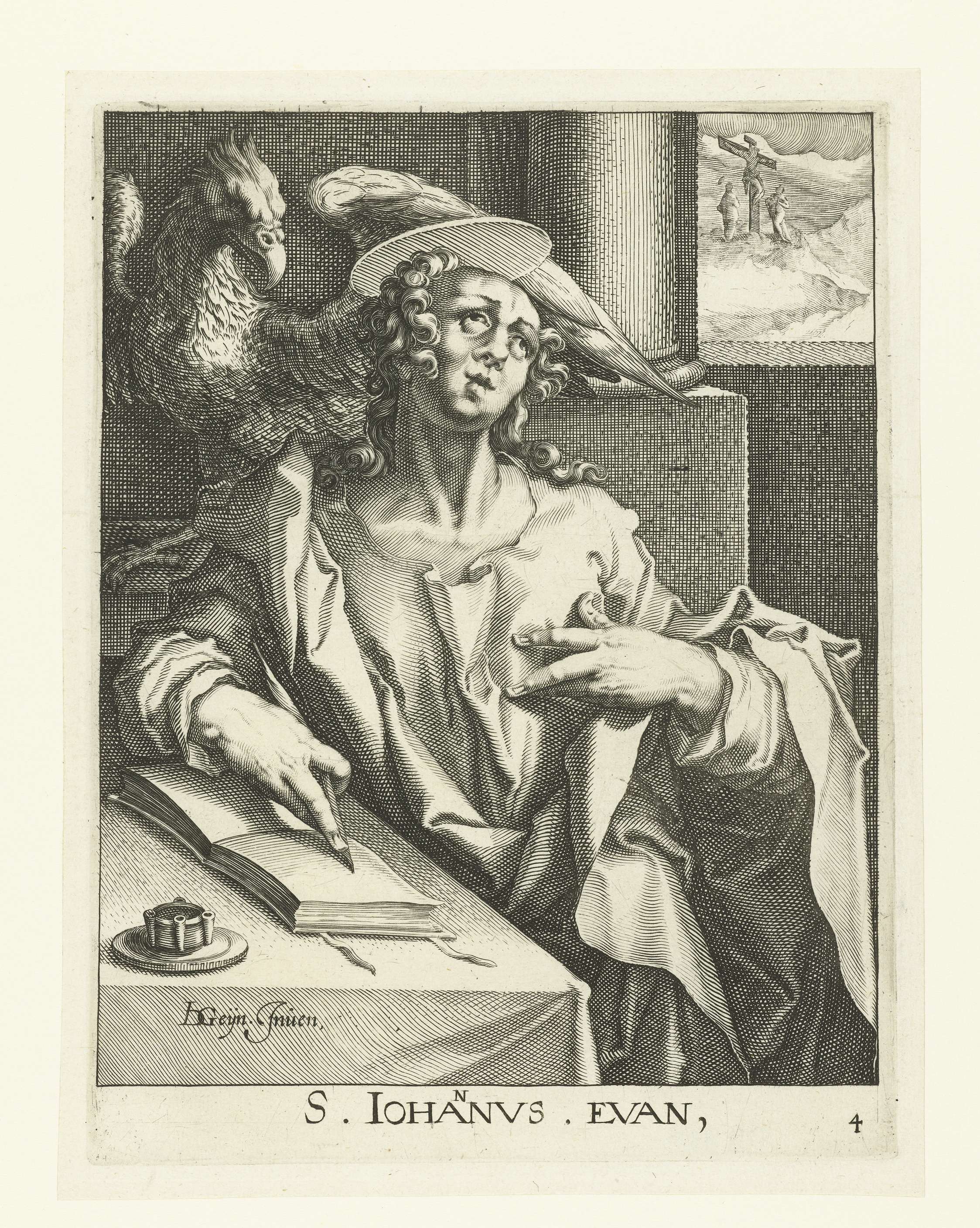 Johannes de evangelist, gezeten, schrijvend in een boek. Een adelaar staat bij zijn rechterschouder. Onder de voorstelling de tekst 'S. Iohannvs. evan,'. Deze prent is onderdeel van een serie van vier voorstellingen van de evangelisten, elk met de naam van de betreffende evangelist als onderschrift.