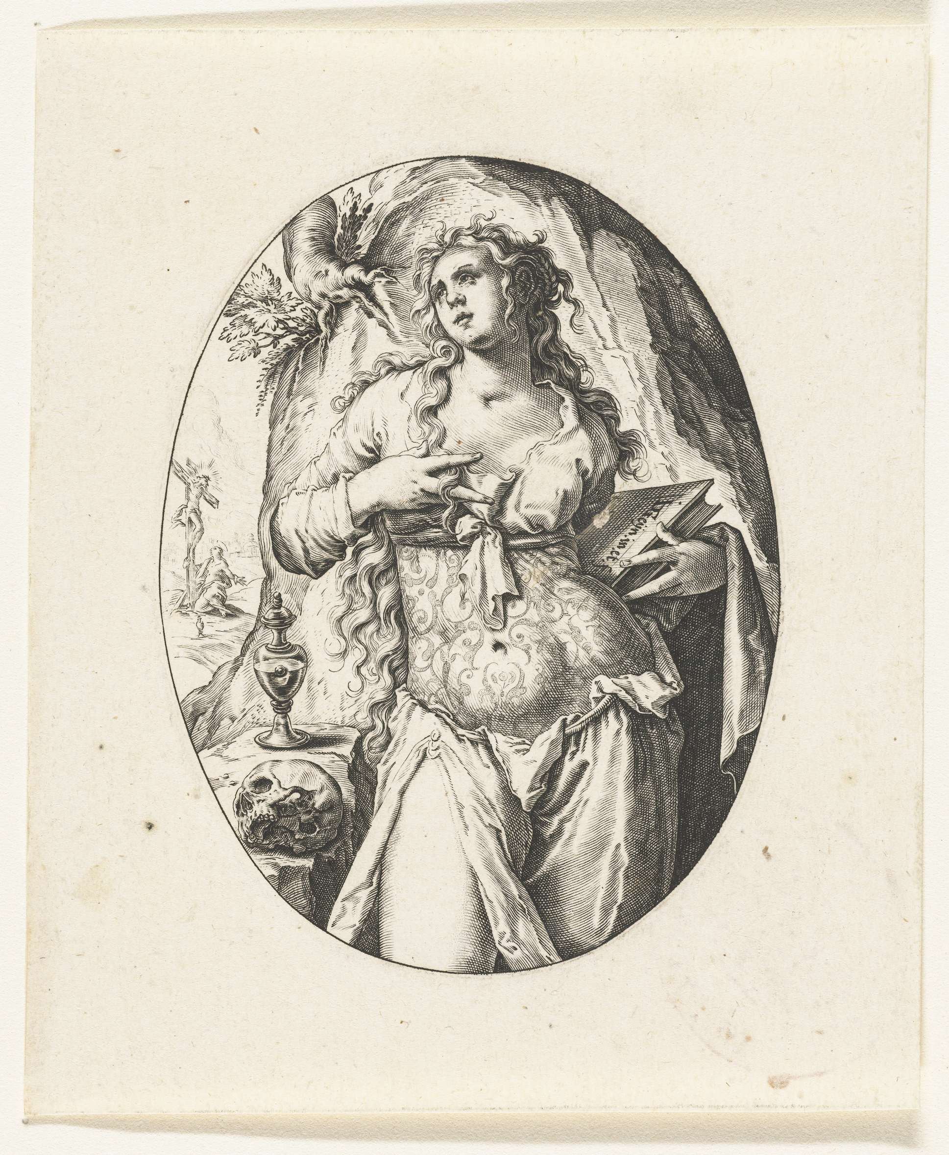 Ovale voorstelling van Maria Magdalena, ten halven lijve, in de linkerhand een boek, staand in een rotsachtige omgeving, naast haar een zalfpot en een schedel. Op de achtergrond Maria Magdalena aan de voet van de gekruisigde Christus.