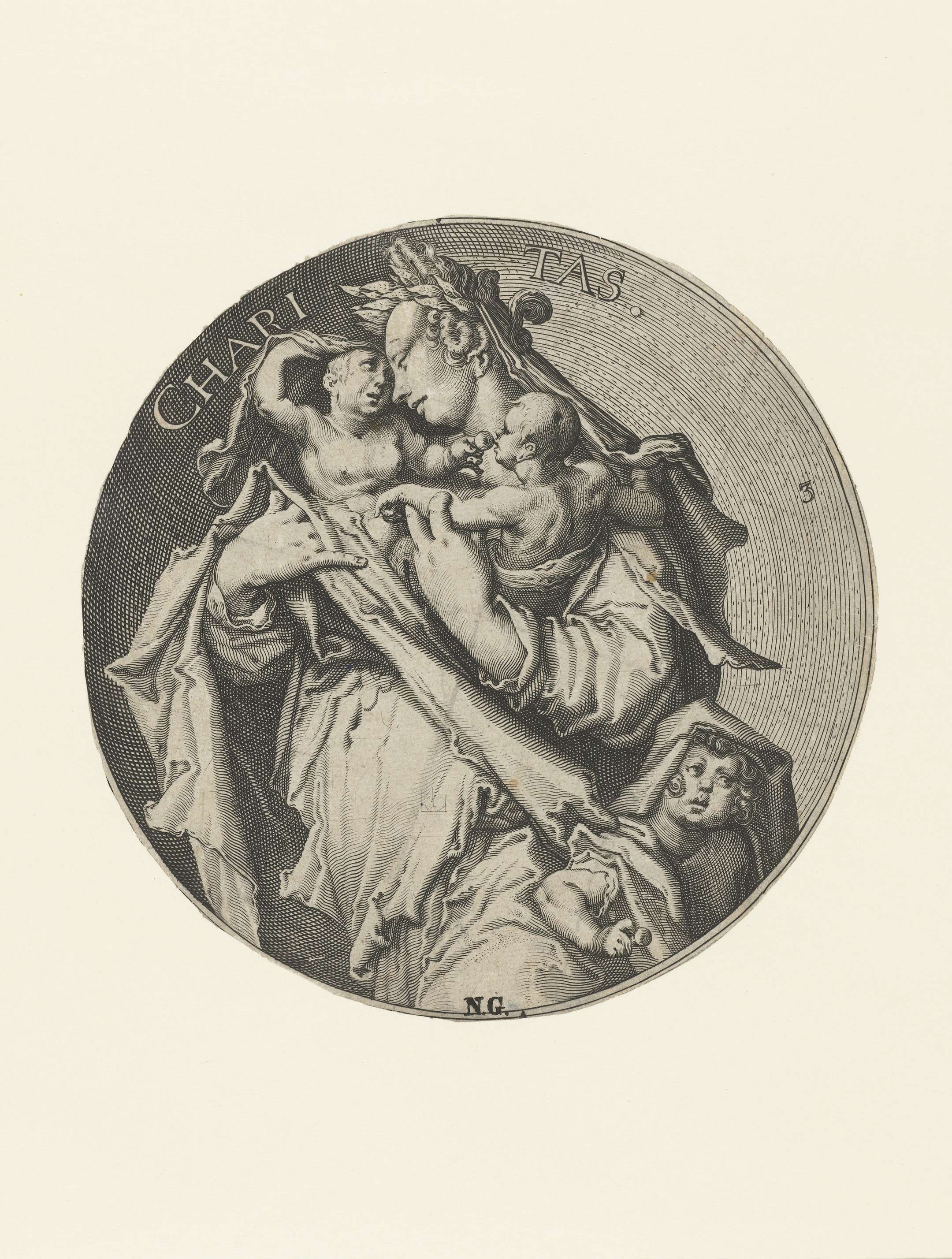 Liefde, in de gedaante van een vrouw met twee kinderen in de armen en een kind aan haar zijde. Bovenin de voorstelling het woord 'CHARITAS.' (liefde). Deze prent is onderdeel van een serie van zeven ronde voorstellingen van de deugden, elk gepersonifieerd door een vrouwenfiguur met typerende attributen, en met Latijns opschrift.