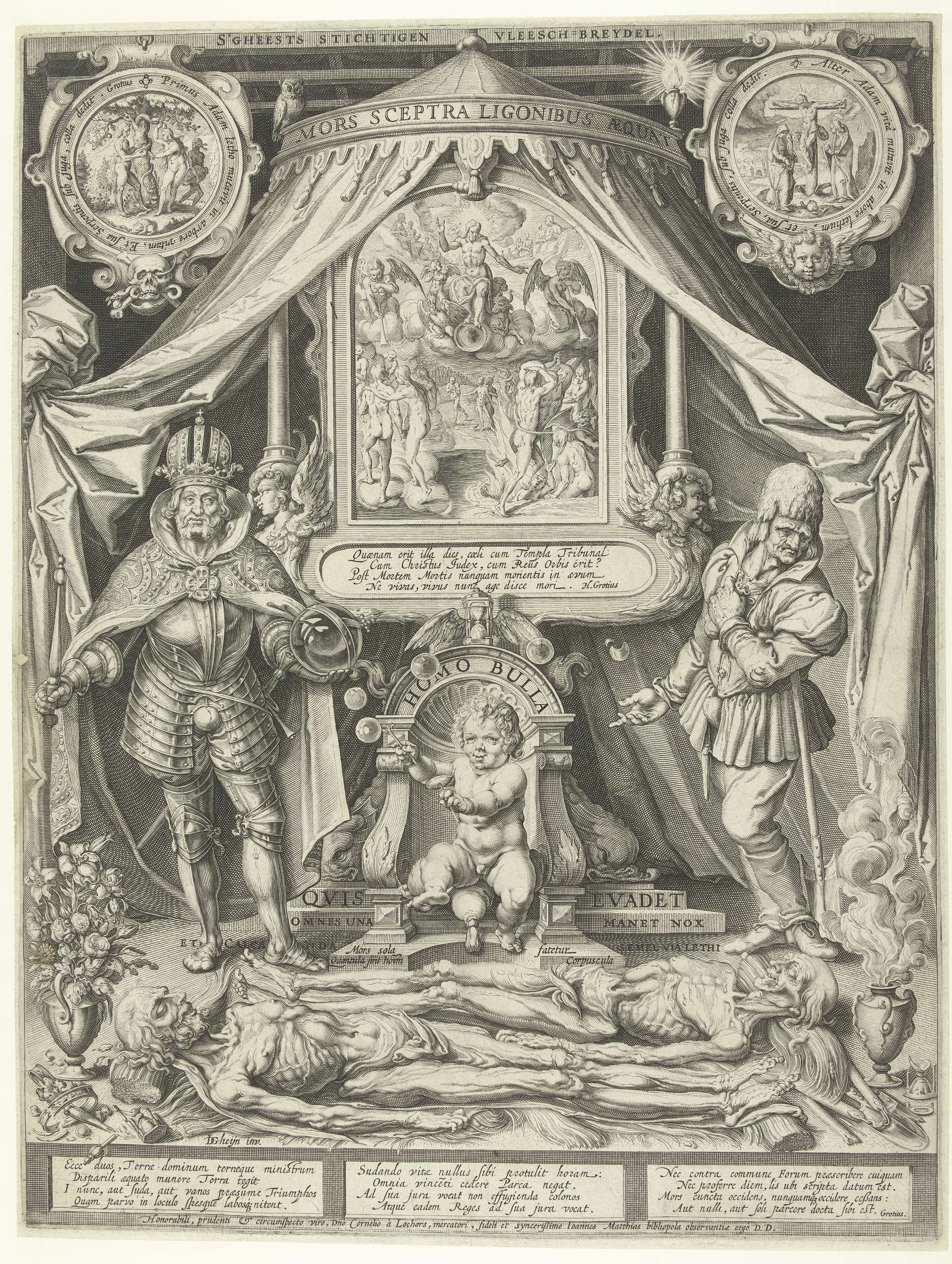 In een ronde tent zit een putto bellen te blazen ('homo bulla' - 'De mens is een zeepbel' - staat op de rand van de nis waar hij in zit), geflankeerd door een keizer en een landarbeider. Boven de putto een voorstelling van het Laatste Oordeel. Linksboven een cartouche met ronde voorstelling van de Zondeval; ...