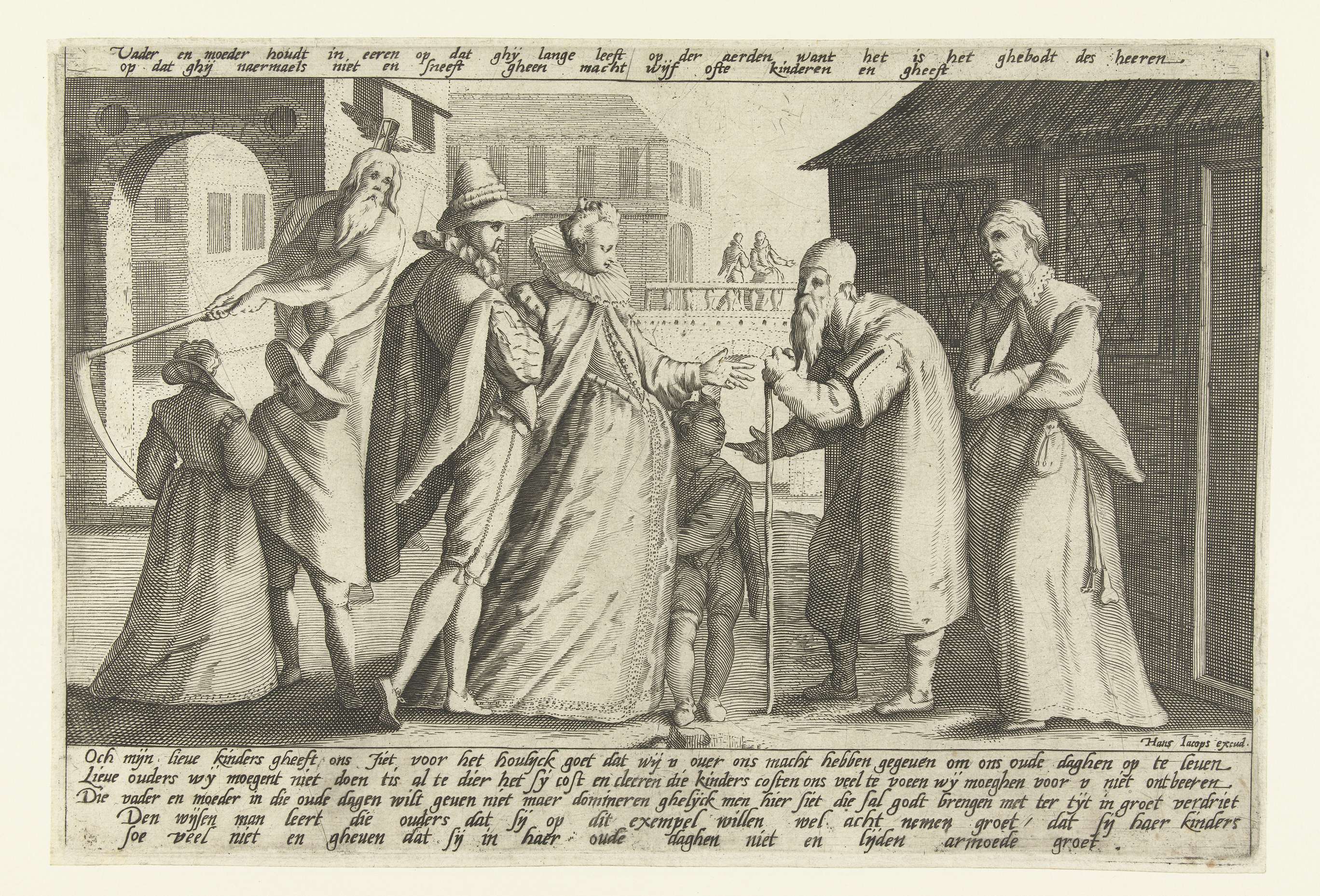 De ouders hebben offers gebracht om hun zoon een goede opvoeding te geven. Als ze, oud en berooid, hem om hulp vragen, weigert hij: zijn eigen kinderen kosten teveel geld. Hij schendt het Vijfde Gebod: Eert uw vader en uw moeder. Maar ook de ouders treft blaam, want zij hadden niet al hun geld moeten ...