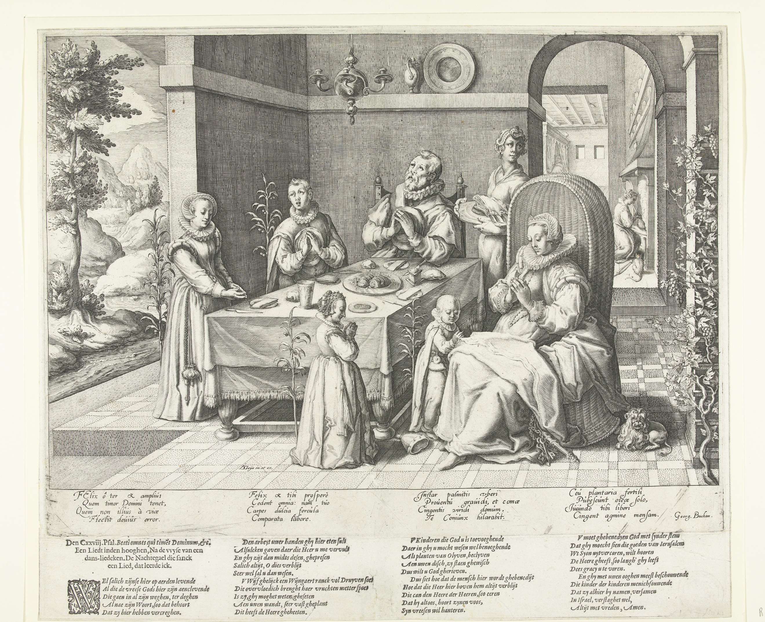 In een vertrek bidden een echtpaar en hun vier kinderen voor de maaltijd die op tafel klaarstaat. Achter de rug van elk van de kinderen groeit een plantje. Een dienstmeisje serveert een stuk vlees op een bord. Op de achtergrond is een dienstmeisje te zien bij een haardvuur. Onder de voorstelling een Latijns gedicht in ...