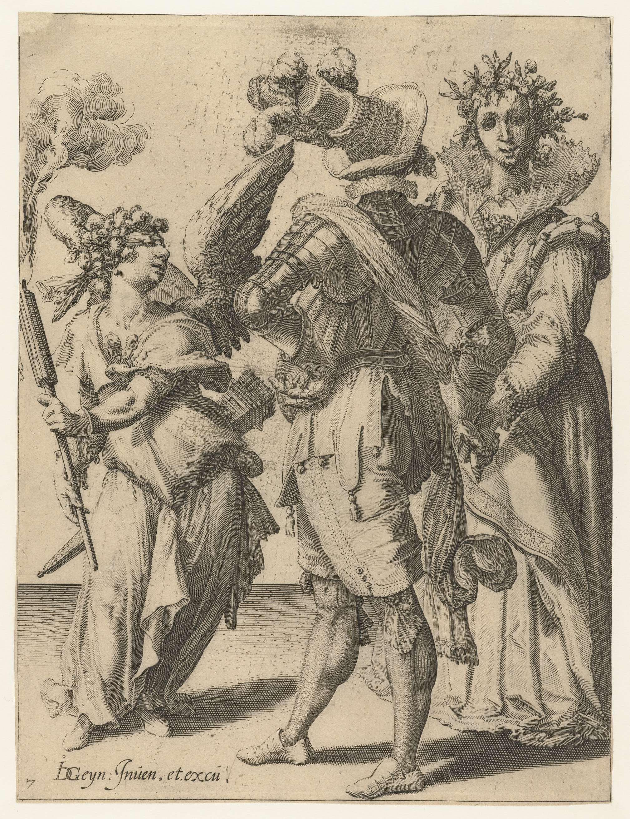 Een geblinddoekte Cupido houdt een brandende fakkel voor een man en een vrouw in feestelijke kledij die hand in hand naast hem staan. Deze prent is onderdeel van een serie van tien genummerde prenten: een titelprent en negen prenten waarop twee of drie gemaskerde en/of verklede figuren ten voeten uit zijn weergegeven.