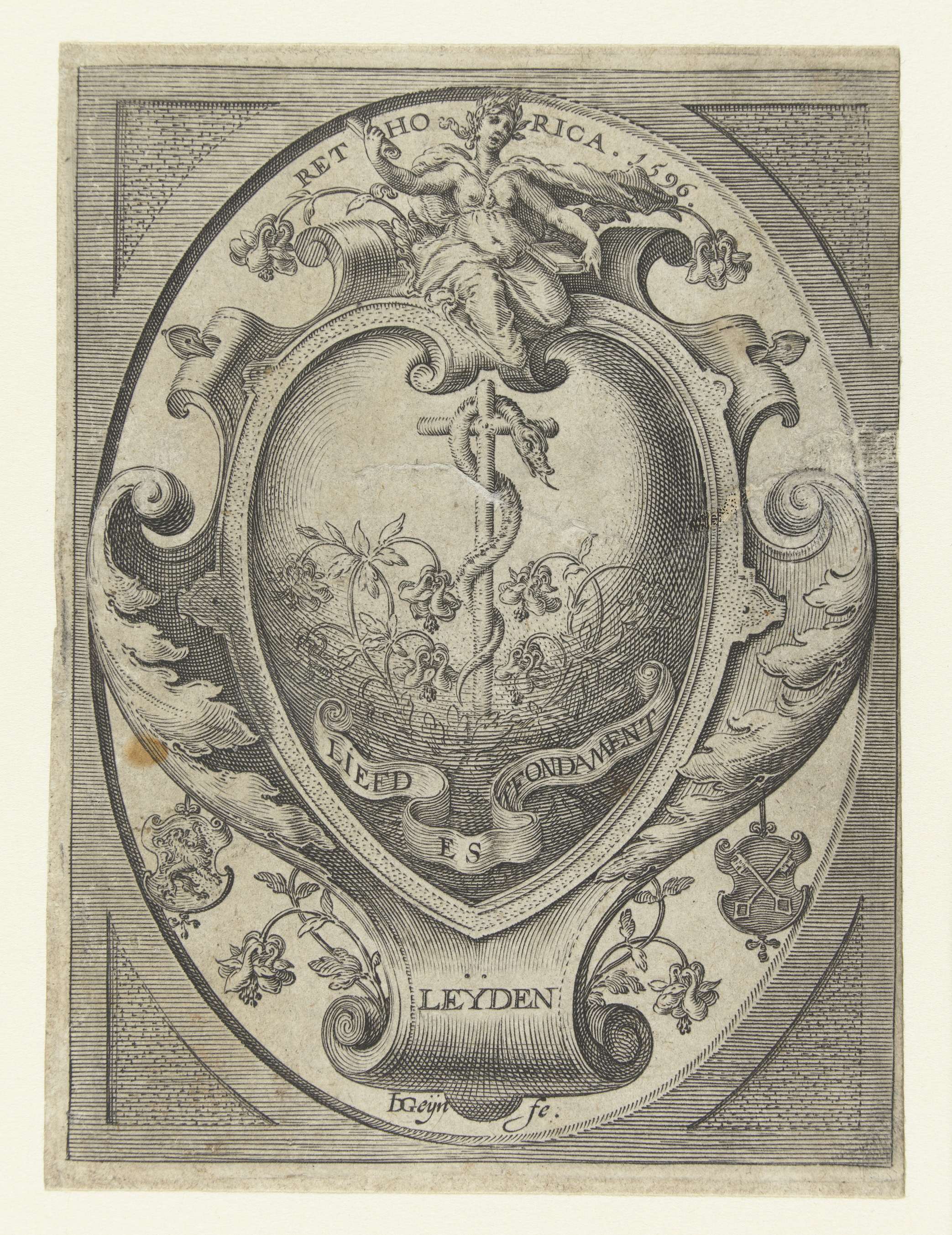 Wapen van de Leidse rederijkerskamer Liefde is 't fondament (hier gespeld als 'Liefd es t fondament'), namelijk een slang rond een kruis temidden van bloemen, gevat in een min of meer hartvormige omlijsting, waaraan onderaan het wapen van Leiden en het wapen van Holland hangen, en waarop vrouwe Retorica zit.