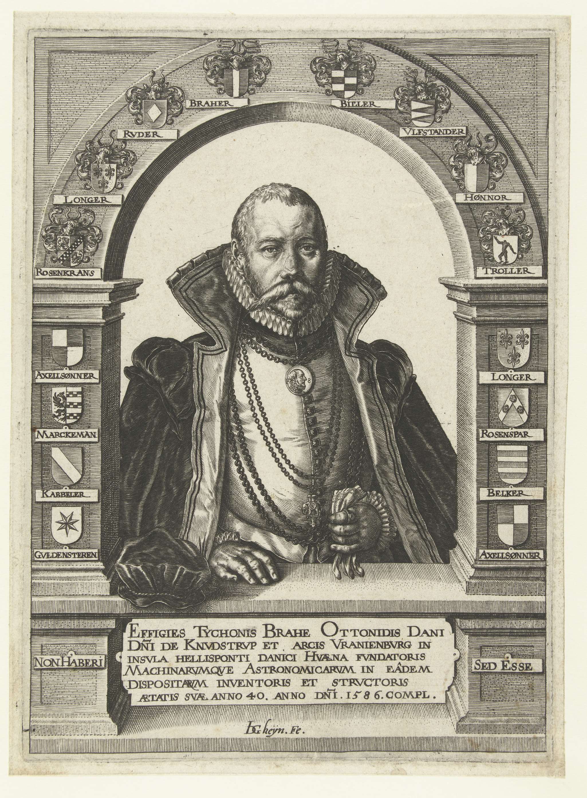 Tycho Brahe op veertigjarige leeftijd, ten halven lijve, van voren gezien, in een boogvormige nis, gekleed in mantel met opstaande kraag, waaronder een geplooide kraag. Kettingen om de hals, handschoen(en) in de linkerhand, muts op de vensterbank bij de rechterhand. Op de boogvormige nis verschillende wapens met familienamen erbij. Latijns onderschrift in cartouche. Aan weerszijden ...