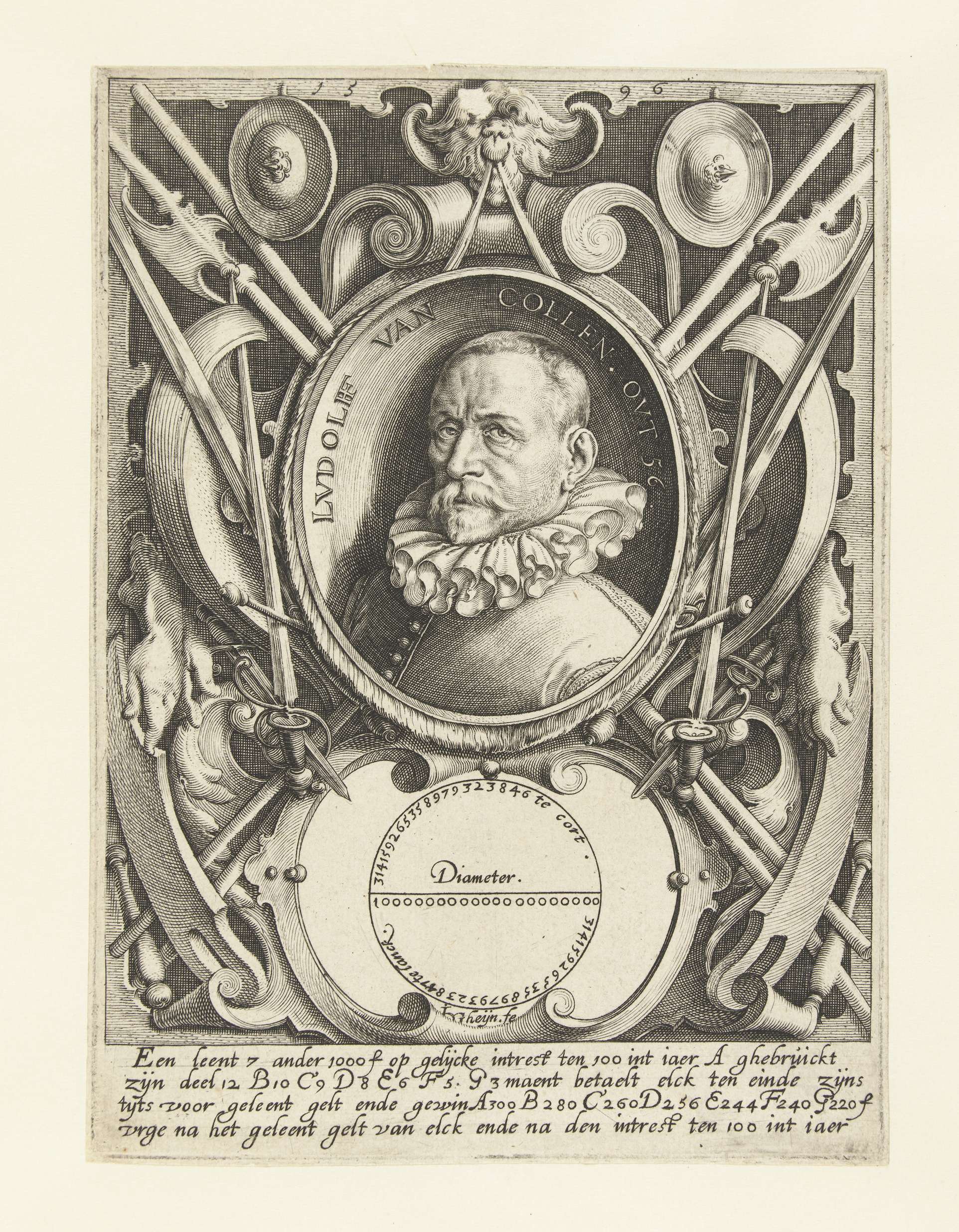 Buste van Ludolf van Ceulen (Hildesheim, 28 januari 1540 - Leiden, 31 december 1610) op 56-jarige leeftijd, met losgeplooide kraag, in ovaal met randschrift, gevat in ornamentlijst met rolwerk en wapens. Onder het portret een afbeelding van een cirkel met een beschrijving van het getal pi. Onder de voorstelling een vierregelig Nederlands onderschrift. Van Ceulen ...