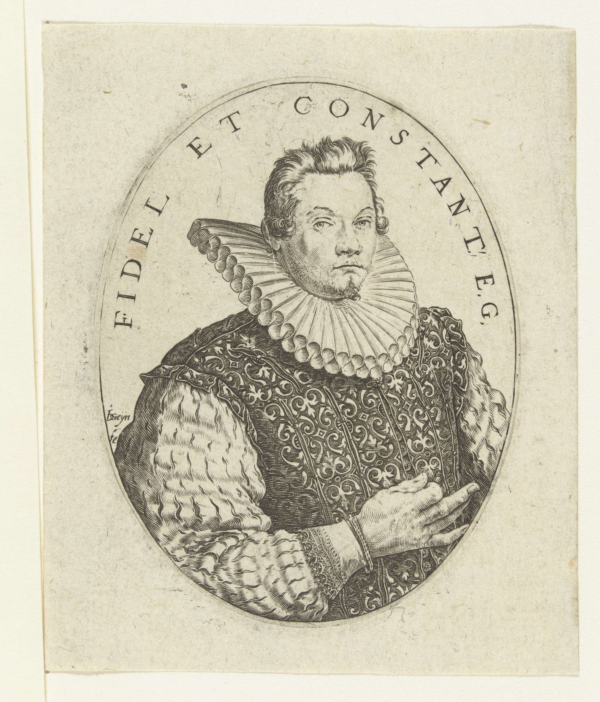 Portret van een man, gekleed in fraai bewerkt wambuis met brede geplooide kraag, de rechterhand voor de borst, in ovaal. Boven het hoofd van de geportretteerde het motto 'FIDEL ET CONSTANT E.G.'.