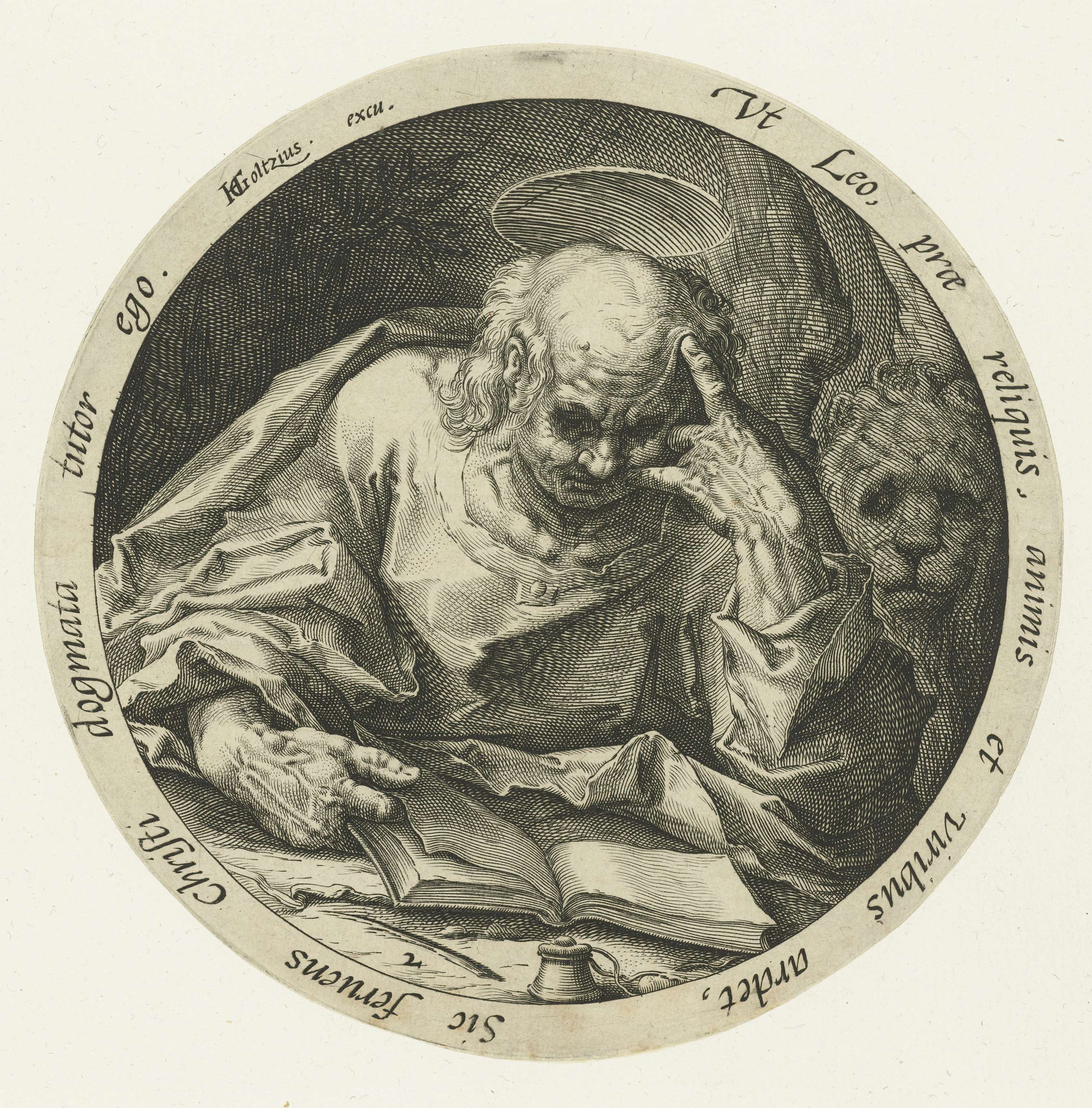 Marcus de evangelist, ten halven lijve, lezend in een boek. Aan zijn linkerzijde staat een gevleugelde leeuw. Om de voorstelling een Latijnse tekst. Deze prent is onderdeel van een serie van vier ronde voorstellingen van de evangelisten, elk omgeven door een witte band waarin een regel Latijn.
