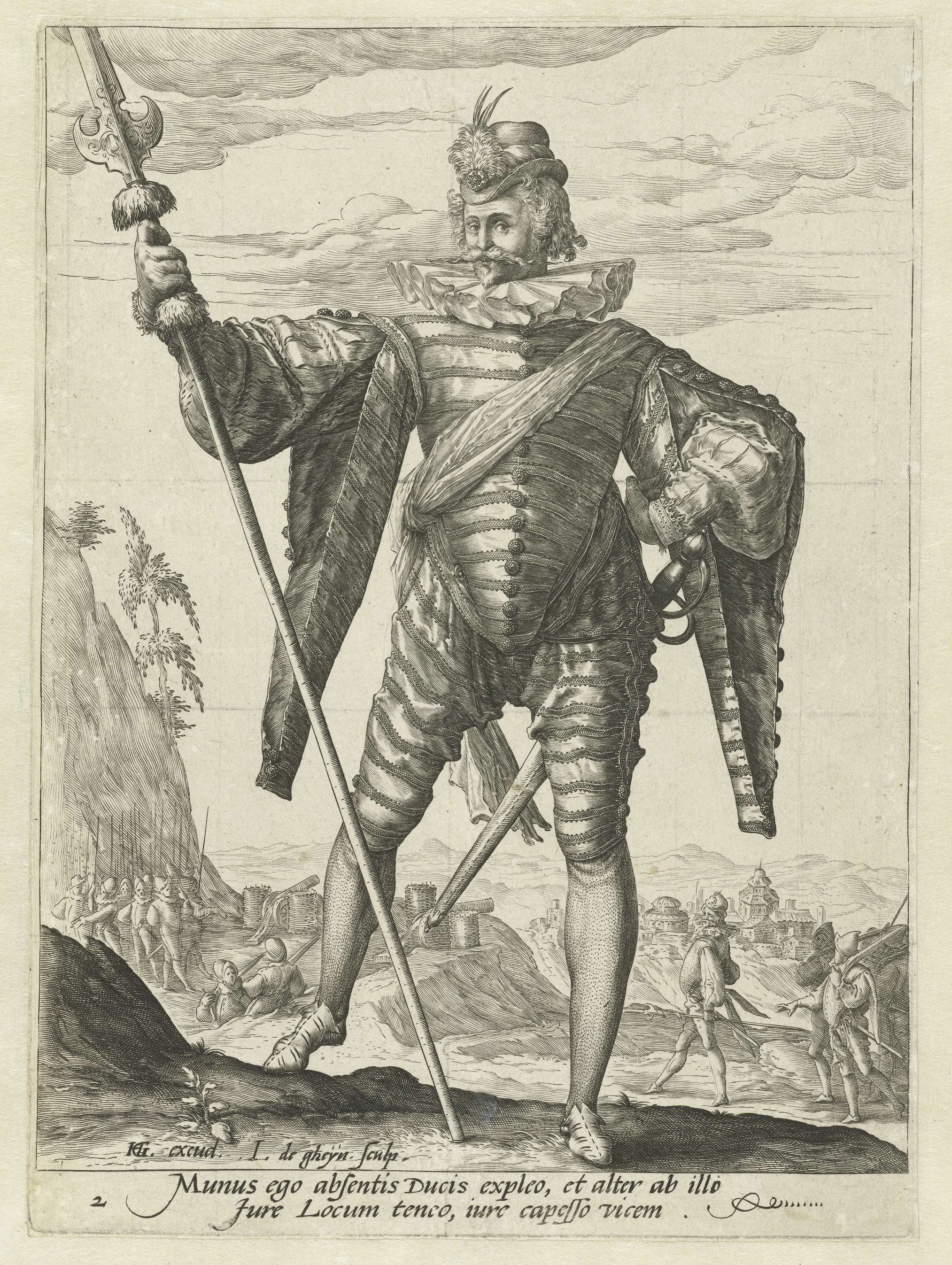 Een man in militaire uitdossing (een luitenant-kolonel), ten voeten uit, een zwaard aan zijn gordel, een stokwapen (partizaan) in zijn rechterhand. Op de achtergrond een heuvelachtig landschap waarin een stad belegerd wordt. Onder de voorstelling twee regels tekst in Latijn. Deze prent is onderdeel van een serie van 12 genummerde prenten van militairen, ten voeten ...