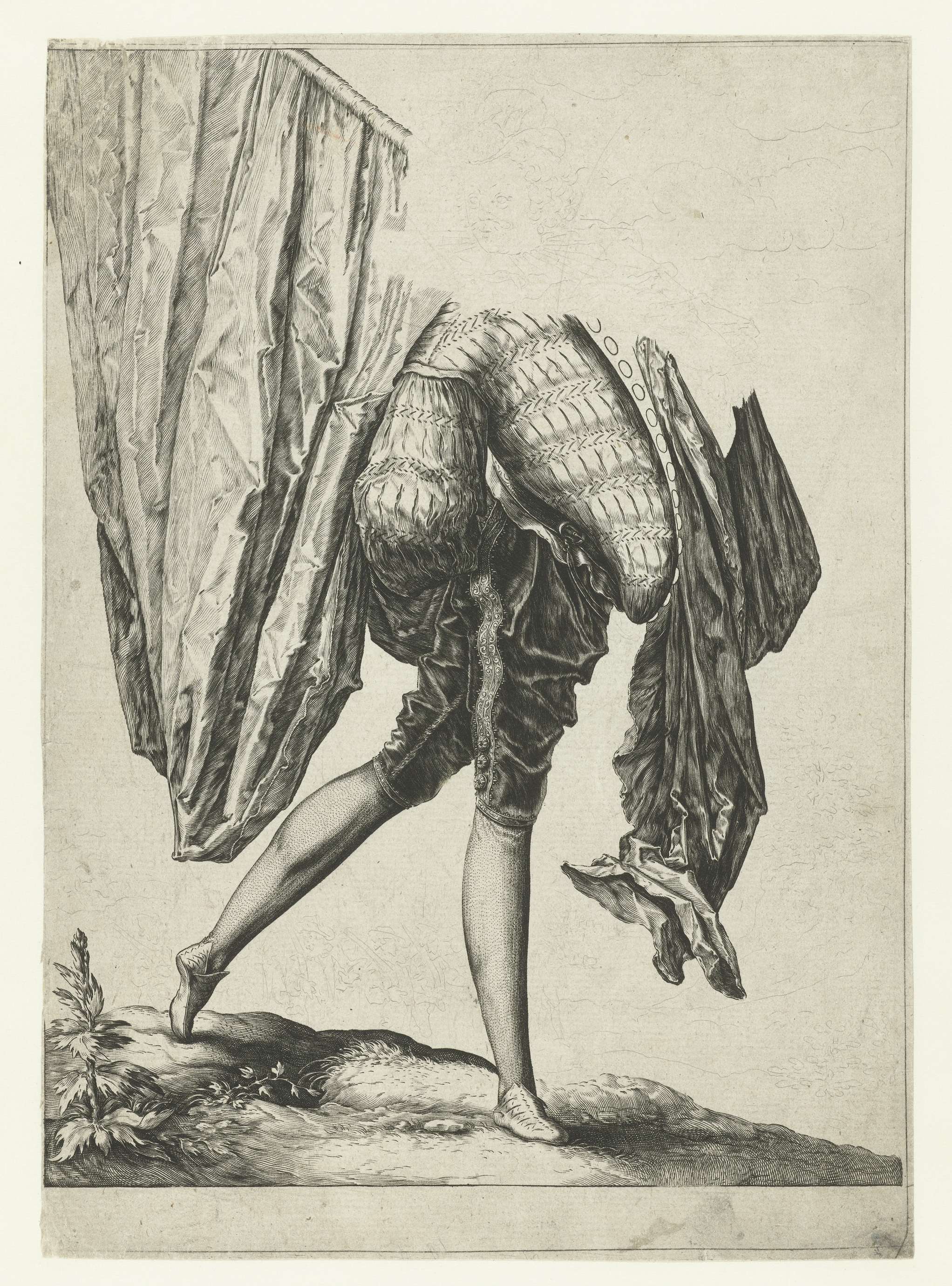 Proefdruk voor een voorstelling van een vaandeldrager: een man met een groot vaandel over zijn linkerschouder, ten voeten uit, op de rechterzijde gezien. Zijn hoofd en de achtergrond zijn nog niet in prent gebracht; deze delen zijn met potlood wel licht ingetekend. Onder is ruimte wit gelaten voor een onderschrift. Deze prent (althans de definitieve ...