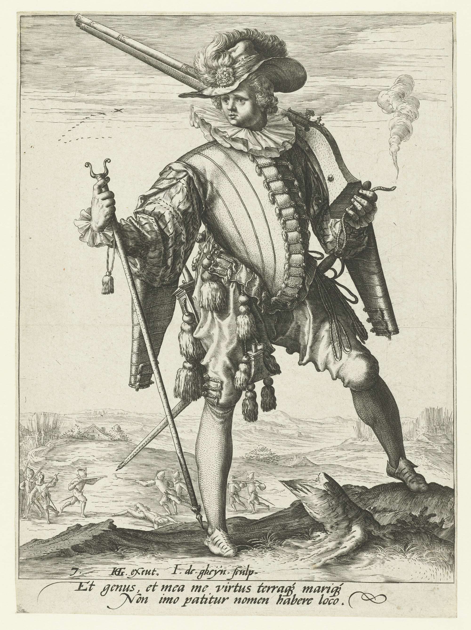 Een soldaat met een geweer (musket) en een brandende lont in de linkerhand en een furketstok in de rechterhand, ten voeten uit. Op de achtergrond een heuvelachtig landschap waarin soldaten elkaar beschieten. Onder de voorstelling twee regels tekst in Latijn. Deze prent is onderdeel van een serie van 12 genummerde prenten van militairen, ten voeten ...