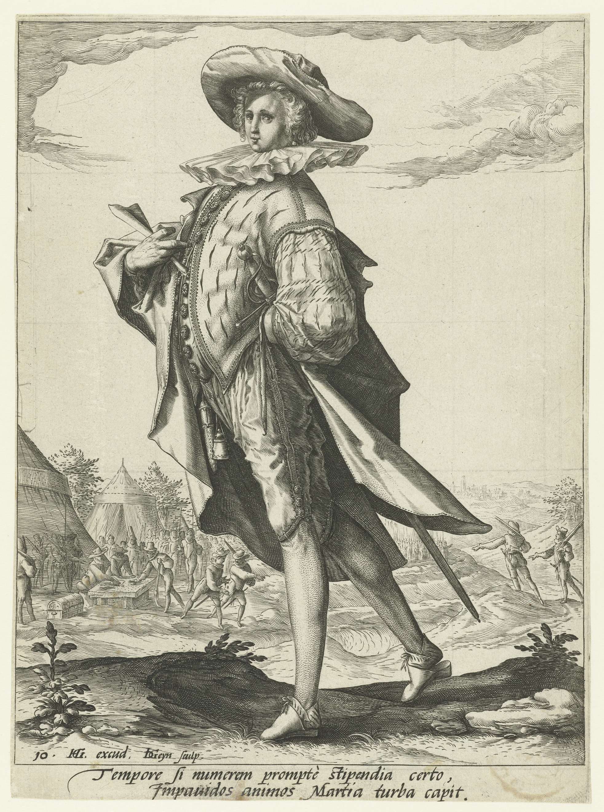 Een man met een opgerold stuk papier in de rechterhand (een schatmeester), ten voeten uit, op de linkerzijde gezien, een zwaard aan zijn gordel. Op de achtergrond een legerkamp waarin een schatmeester uit een grote kist aan een tafel in de open lucht betalingen verricht aan soldaten. Onder de voorstelling twee regels tekst in Latijn. ...