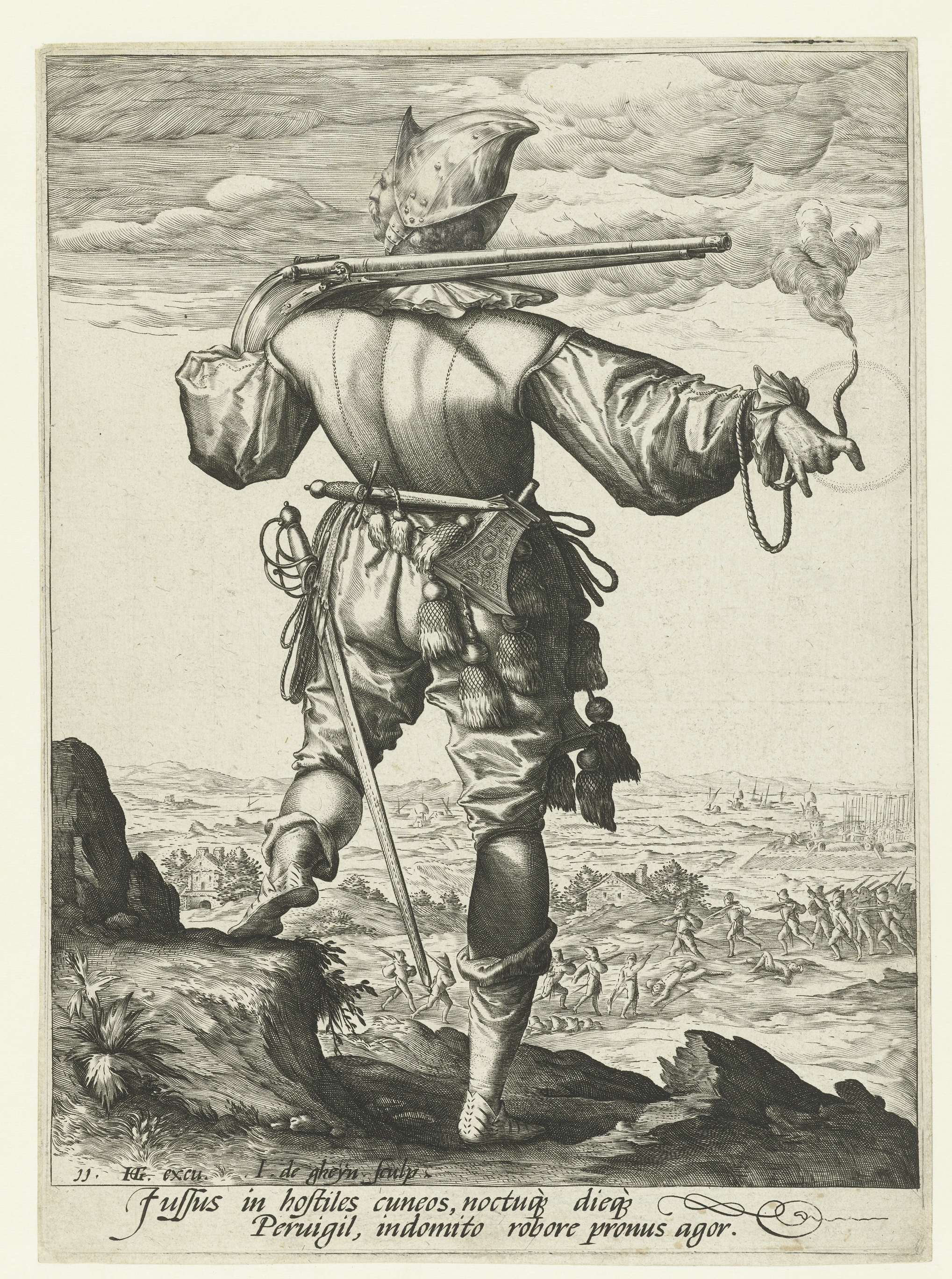 Een soldaat met een geweer (musket of harquebus) over de linkerschouder, een brandende lont in de rechterhand en een zwaard aan de linkerzij, ten voeten uit, op de rug gezien. Op de achtergrond een kustlandschap waarin soldaten elkaar beschieten. Onder de voorstelling twee regels tekst in Latijn. Deze prent is onderdeel van een serie van ...