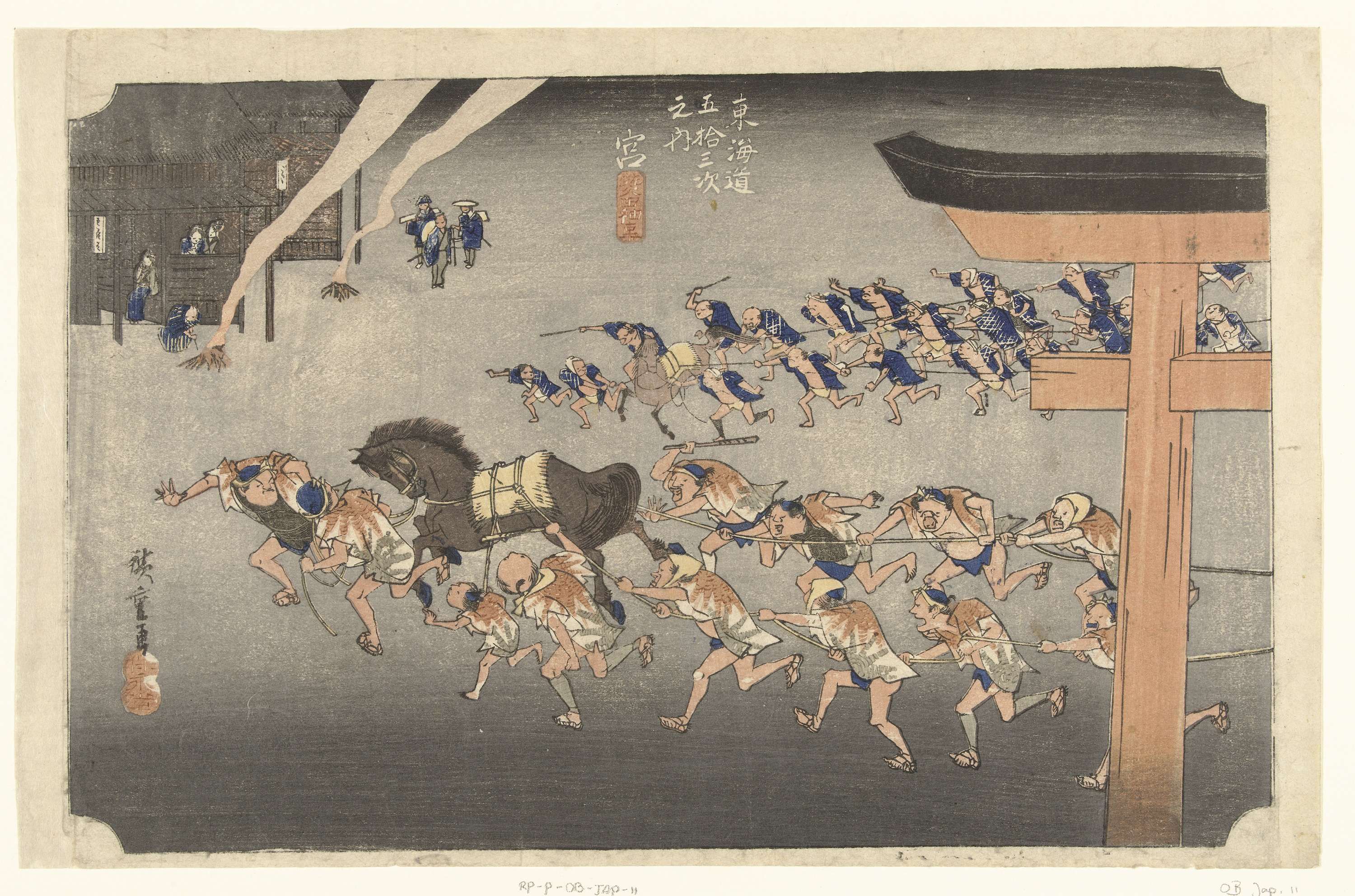 Twee groepen mannen, zich vasthoudend aan touwen bevestigd aan aangedreven paarden; op de voorgrond een torii; op de achtergrond toeschouwers bij houten huizen met rokende vuren; bij avond.
