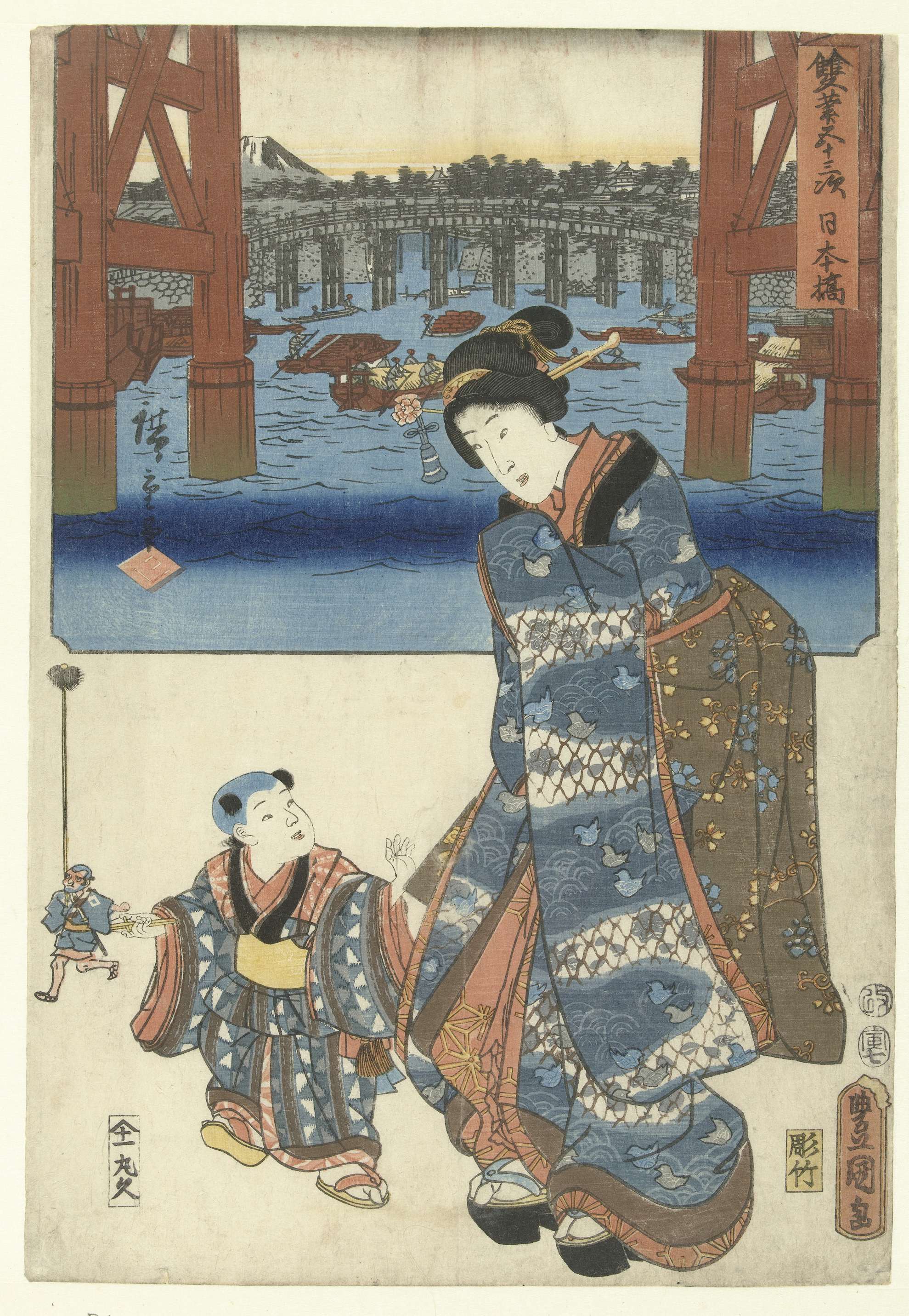 Vrouw in kimono waarop patroon van eenden in een vijver, kijkend naar jongetje met acteurspop als yakkodanser; tegen cartouche met gezicht vanonder de Nihonbashi brug, op de Ryogoku brug, waarachter de berg Fuji. Voorgrond ontworpen door Kunisada, de achtergrond door Hiroshige.