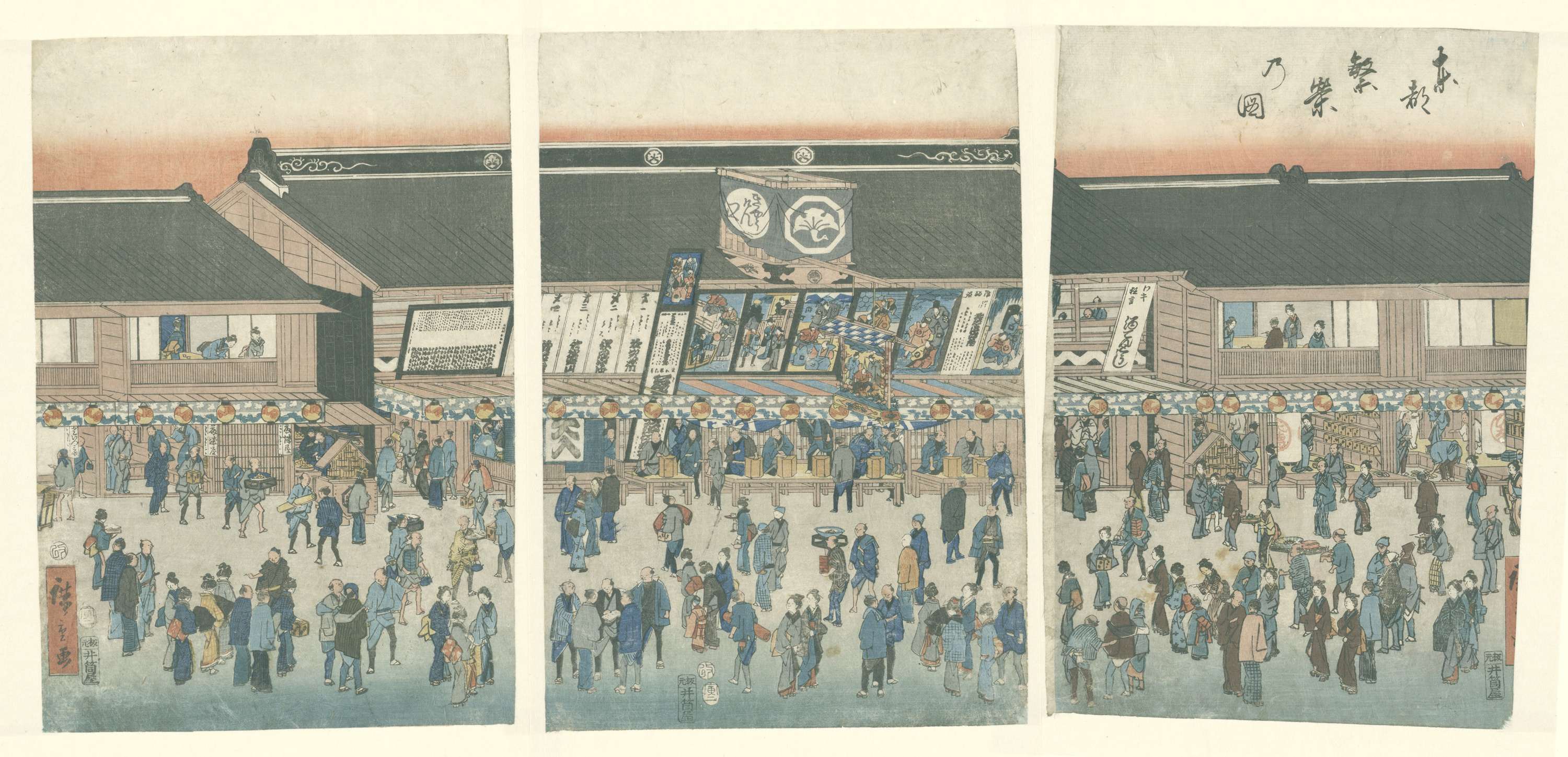 Gezicht op de drukke straat voor het Morita kabuki theater in Saruwakamachi, Edo (het huidige Tokyo). Op verhogingen bij de ingang van het theater zitten de kaartverkopers. Aan weerszijden naast het theater zijn theehuizen afgebeeld. Boven de kaartverkopers grote schilderingen van scenes uit de op te voeren toneelstukken.