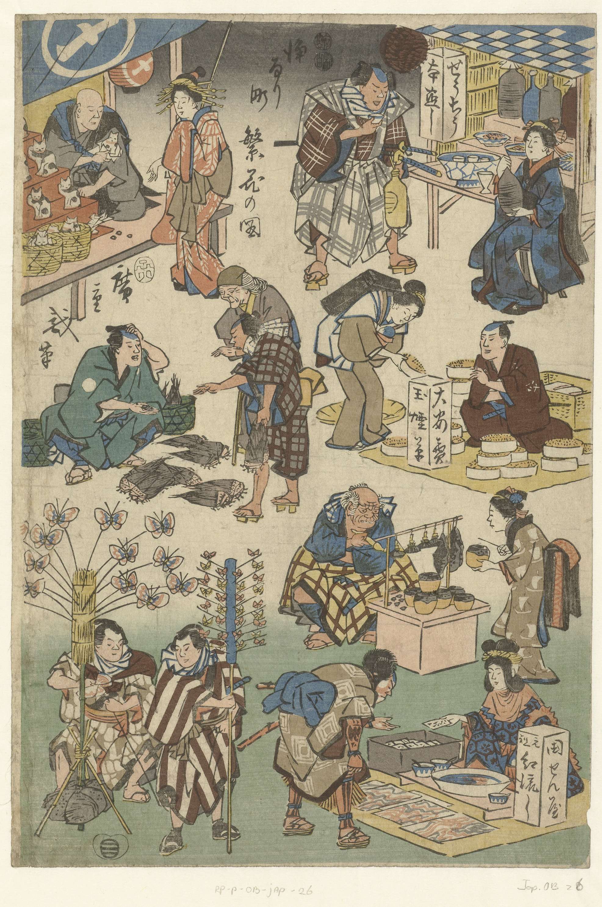 Verschillende marktkraampjes tijdens een avondmarkt waaronder een maneki neko (wenkend kattenbeeld) verkoper, een sake kraampje, een gerstkoopman, een verkoper van bamboewortels en mannen met speelgoed vlinders.