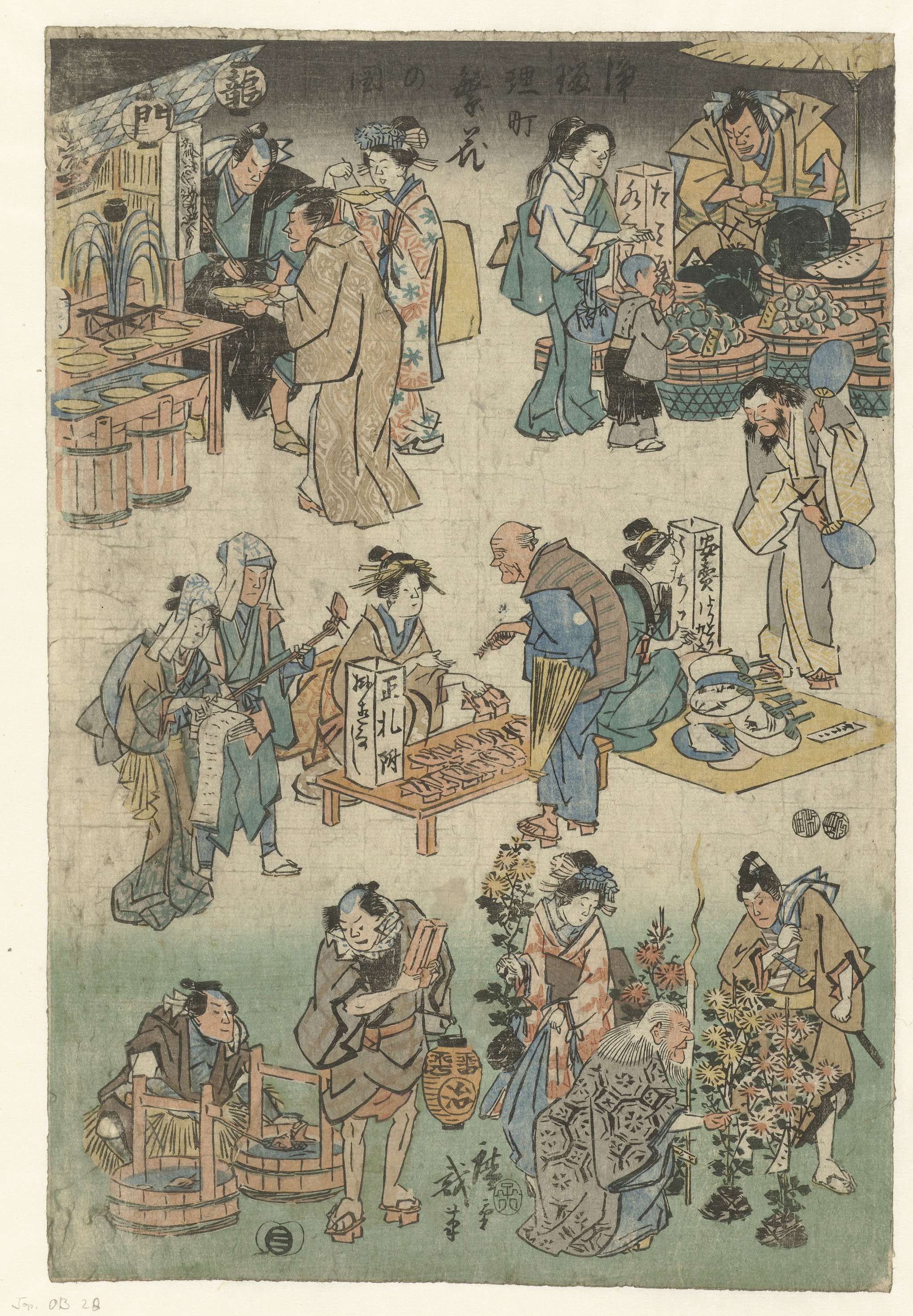Verschillende marktkraampjes tijdens een avondmarkt waaronder een groenteman, een waaierverkoopster, een geta (schoenen) kraampje met muzikanten, een chrysanten verkoper en een man met goudvissen.