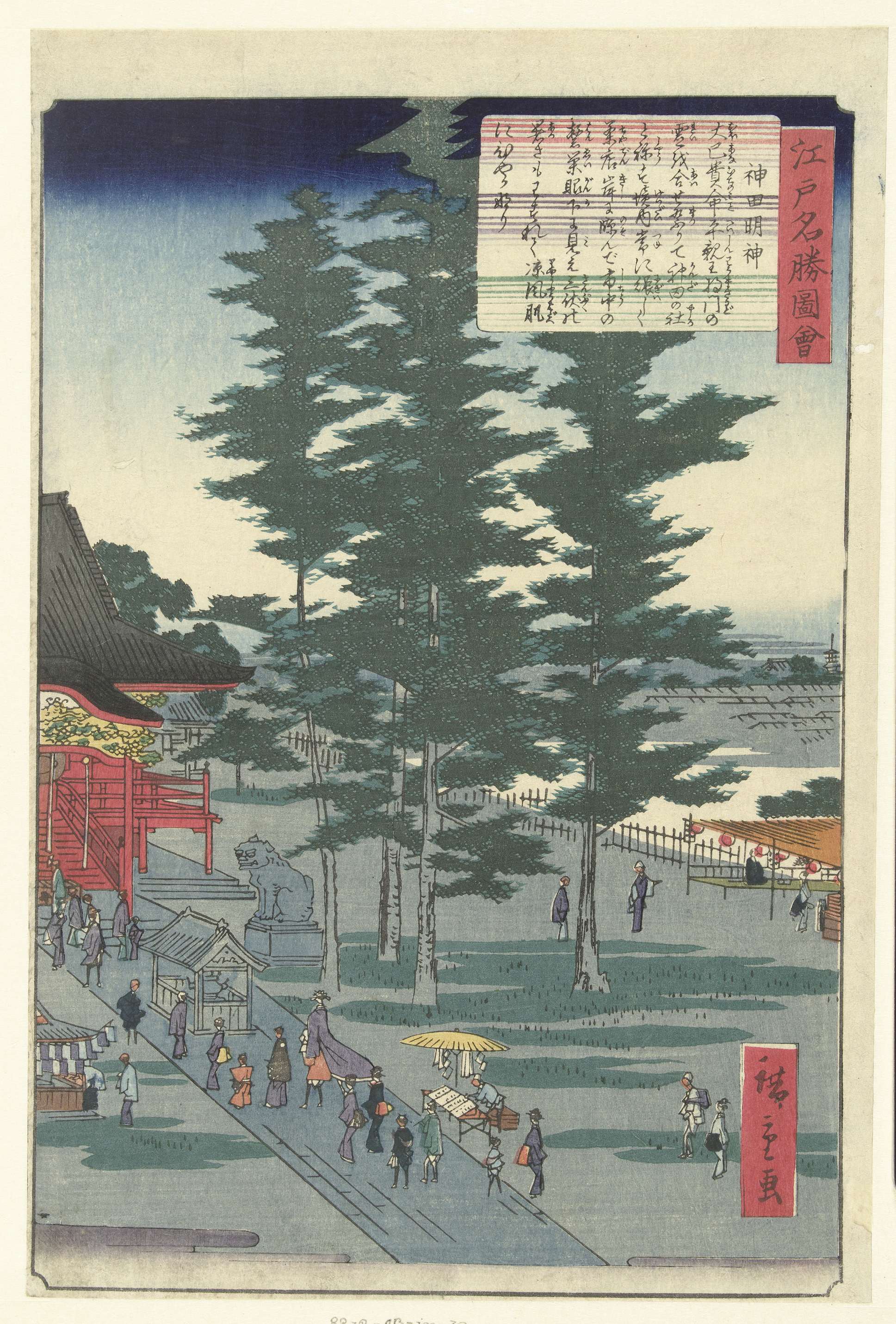 Gezicht op het terrein van de Kanda Myojin tempel met bezoekers bij kraampjes en op het pad leidend naar het rode heiligdom; rechts van de vier hoge bomen uitzicht over de daken van de stad.