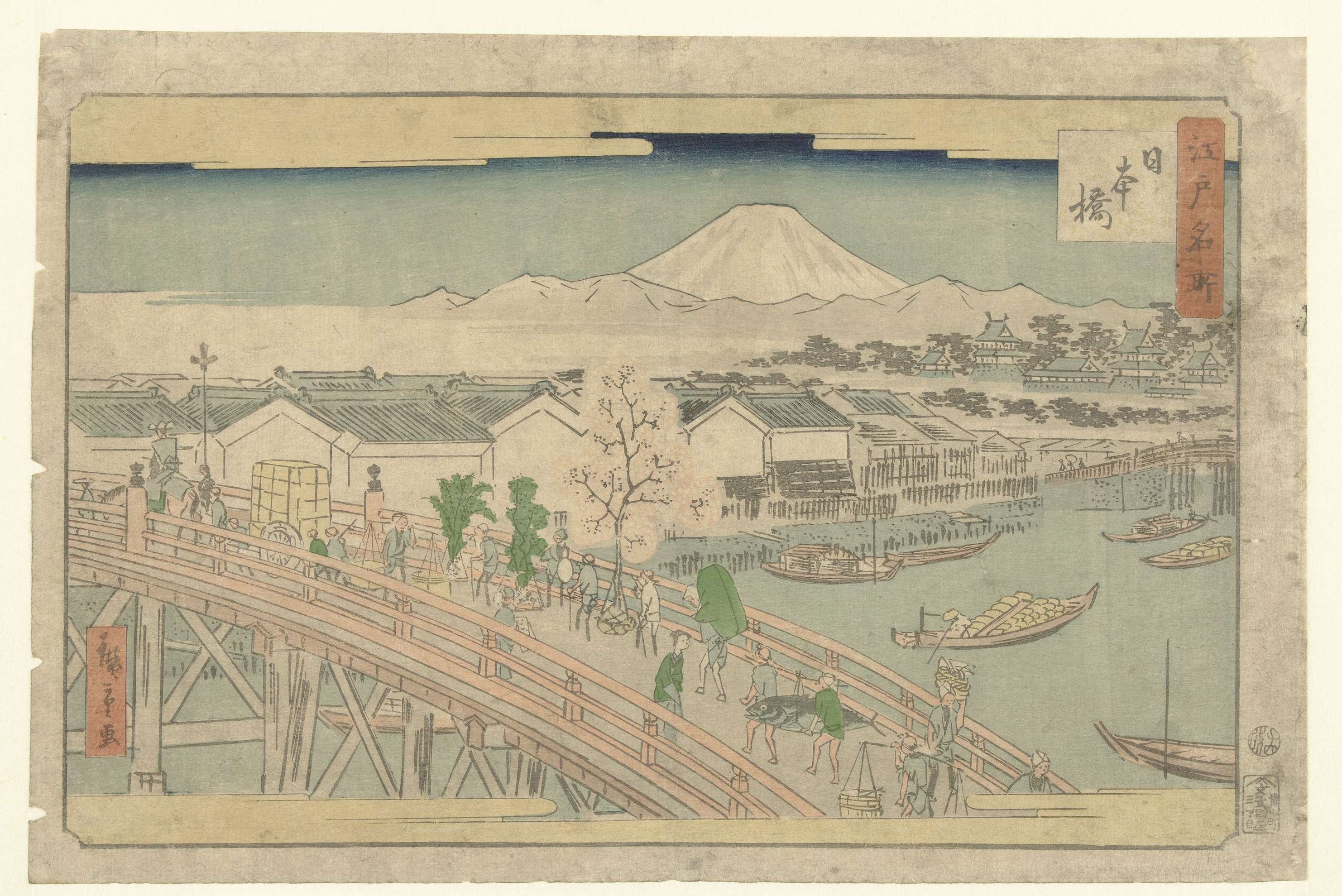 De Nihonbashi brug met reizigers en kooplui; op de achtergrond het Edo kasteel en de berg Fuji. Gestileerde wolkpatronen aan de onder- en bovenkant van de prent.