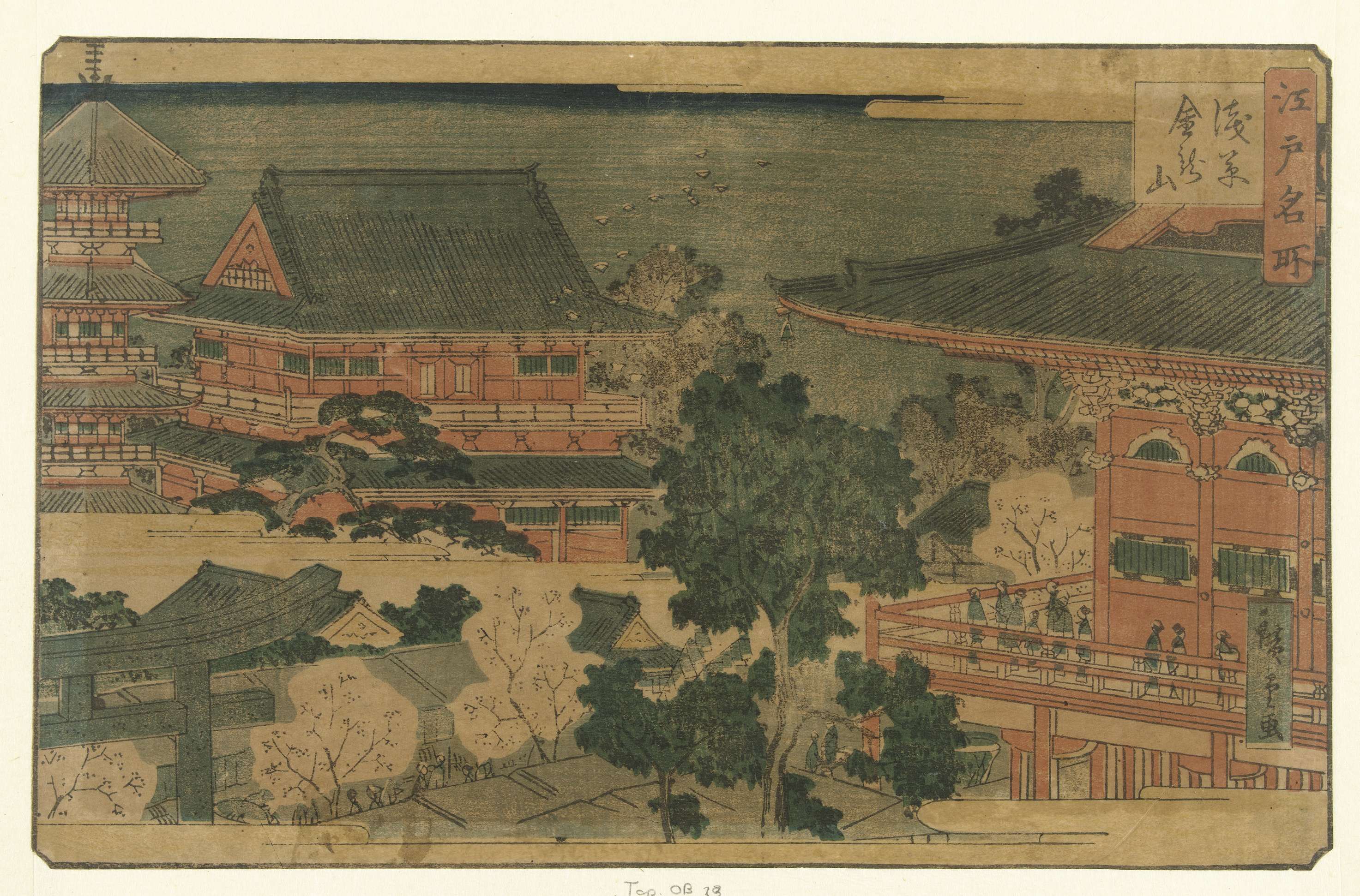 Gezicht op het tempelcomplex van Kinryuzan met bloeiende kersenbomen; op de voorgrond rechts bezoekers op de veranda van een tempel; op de voorgrond links een torii, waarachter een pagode. Gestileerde wolken aan de onder- en bovenkant en in het midden van de prent.
