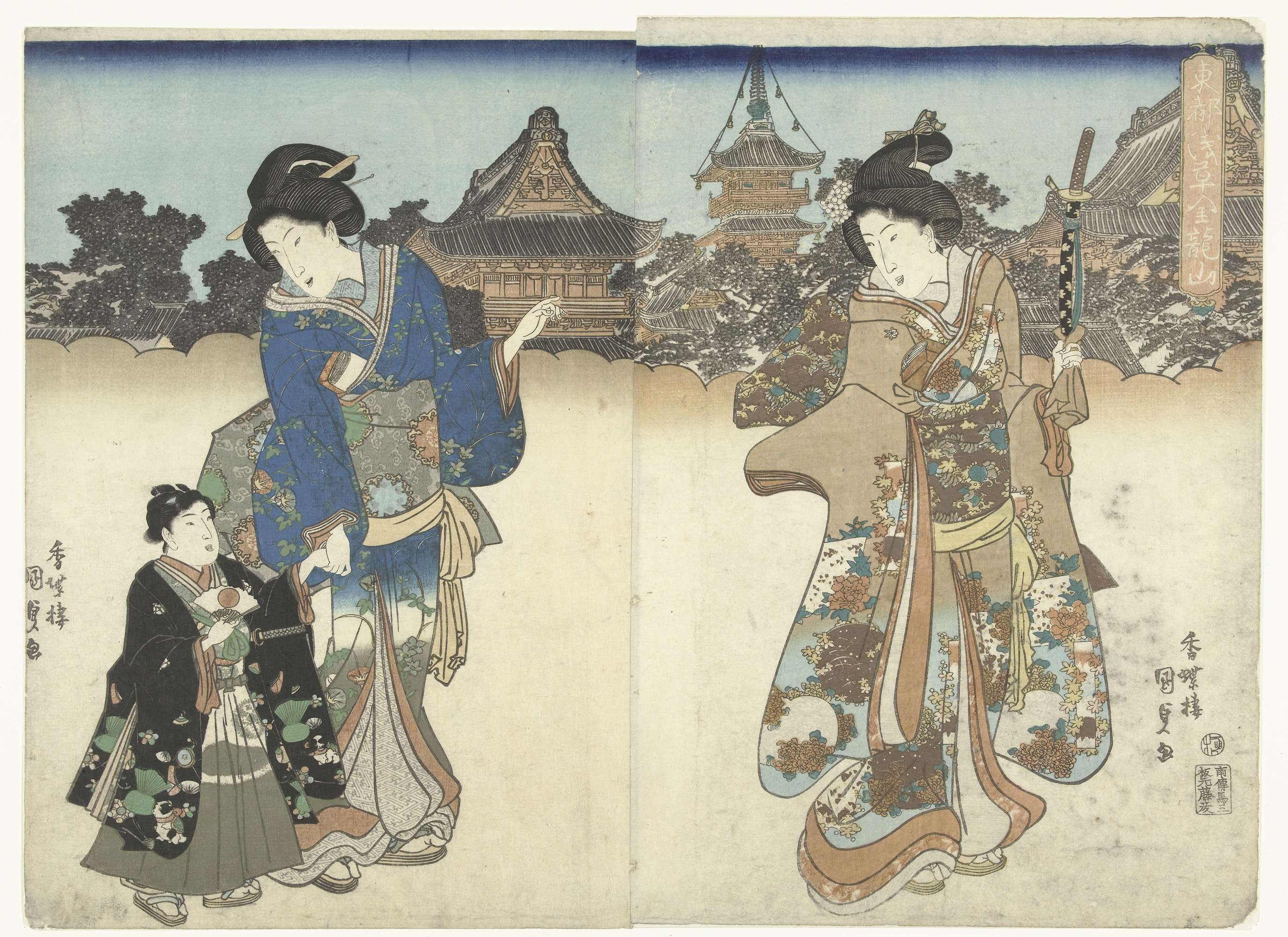 Twee vrouwen en een jongetje op weg naar de Kinryu tempel, weergegeven boven de gestileerde wolken. Het jongetje draagt een zwarte jas waarop een patroon van hondjes en dennenappels, in zijn hand een waaier met de Japanse vlag.