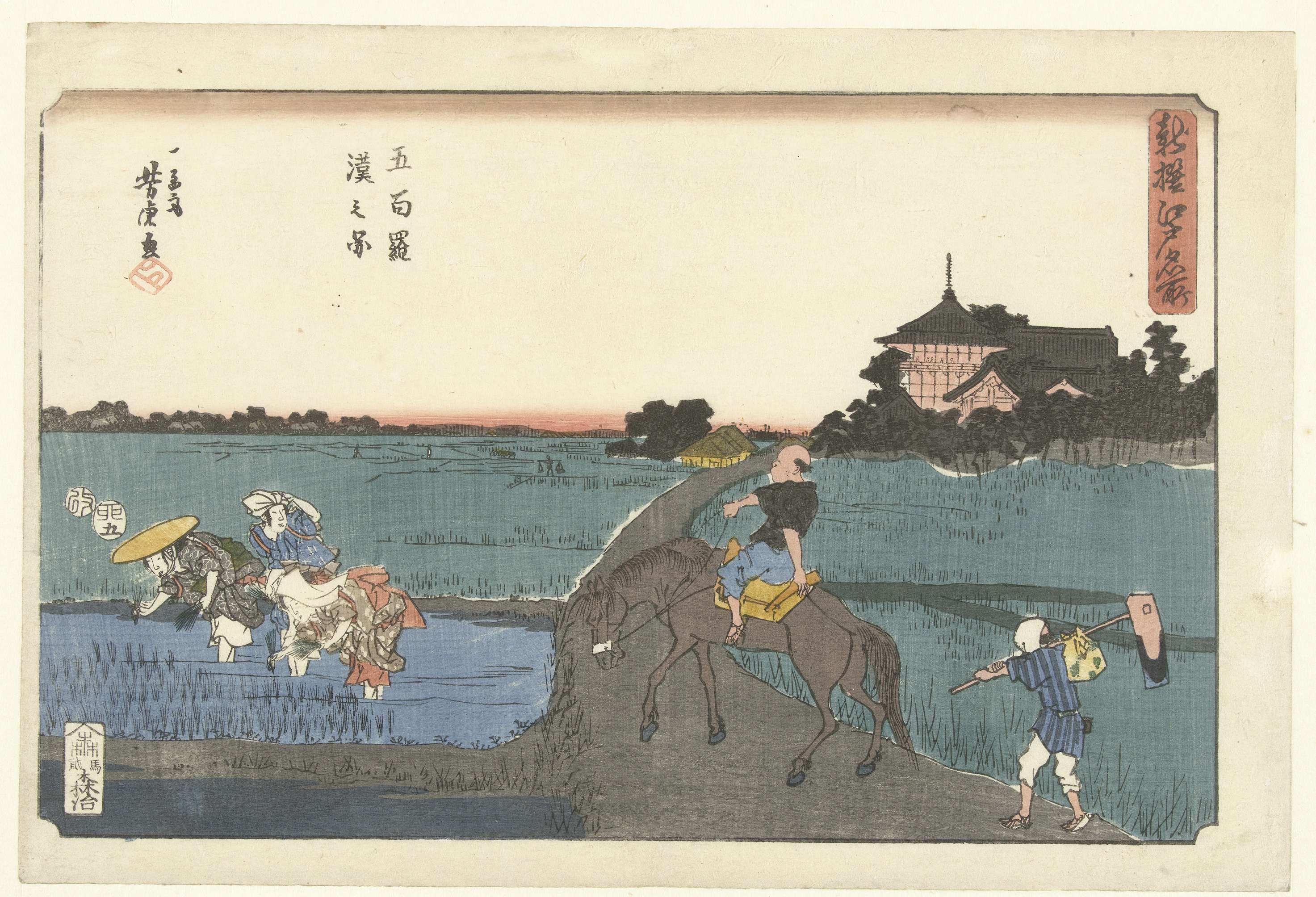 Rijstvelden met de Gohyaku rakan tempel op de achtergrond; op de voorgrond drie rijst plantende vrouwen, een boer en een man te paard.