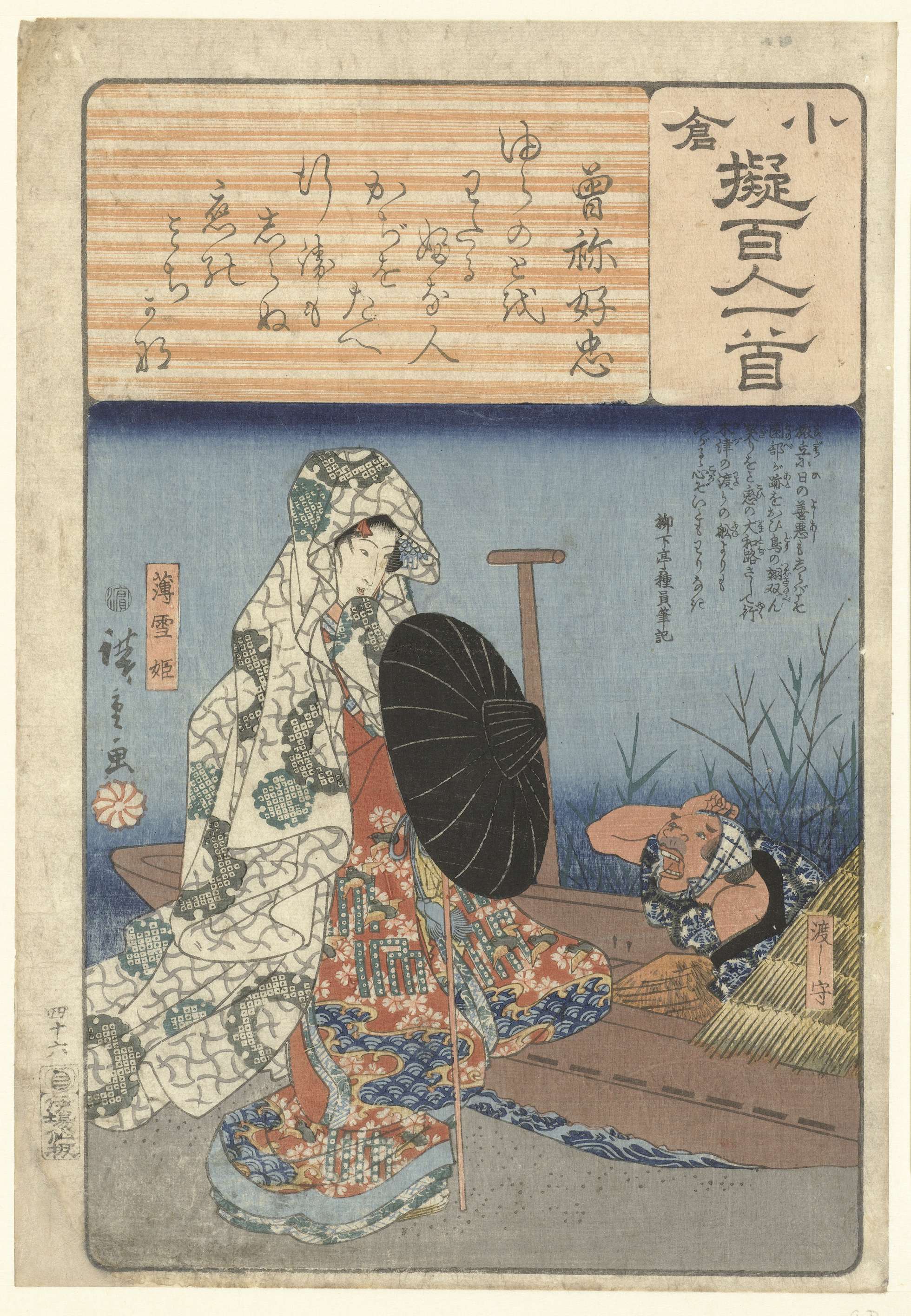 Vrouw in witte mantel met wandelstok en grote zwarte hoed, staand bij veerboot waarin verbaasd opkijkende veerman. Gedicht in oranje gestreept cartouche linksboven; boven veerman een commentaar op de voorstelling.
