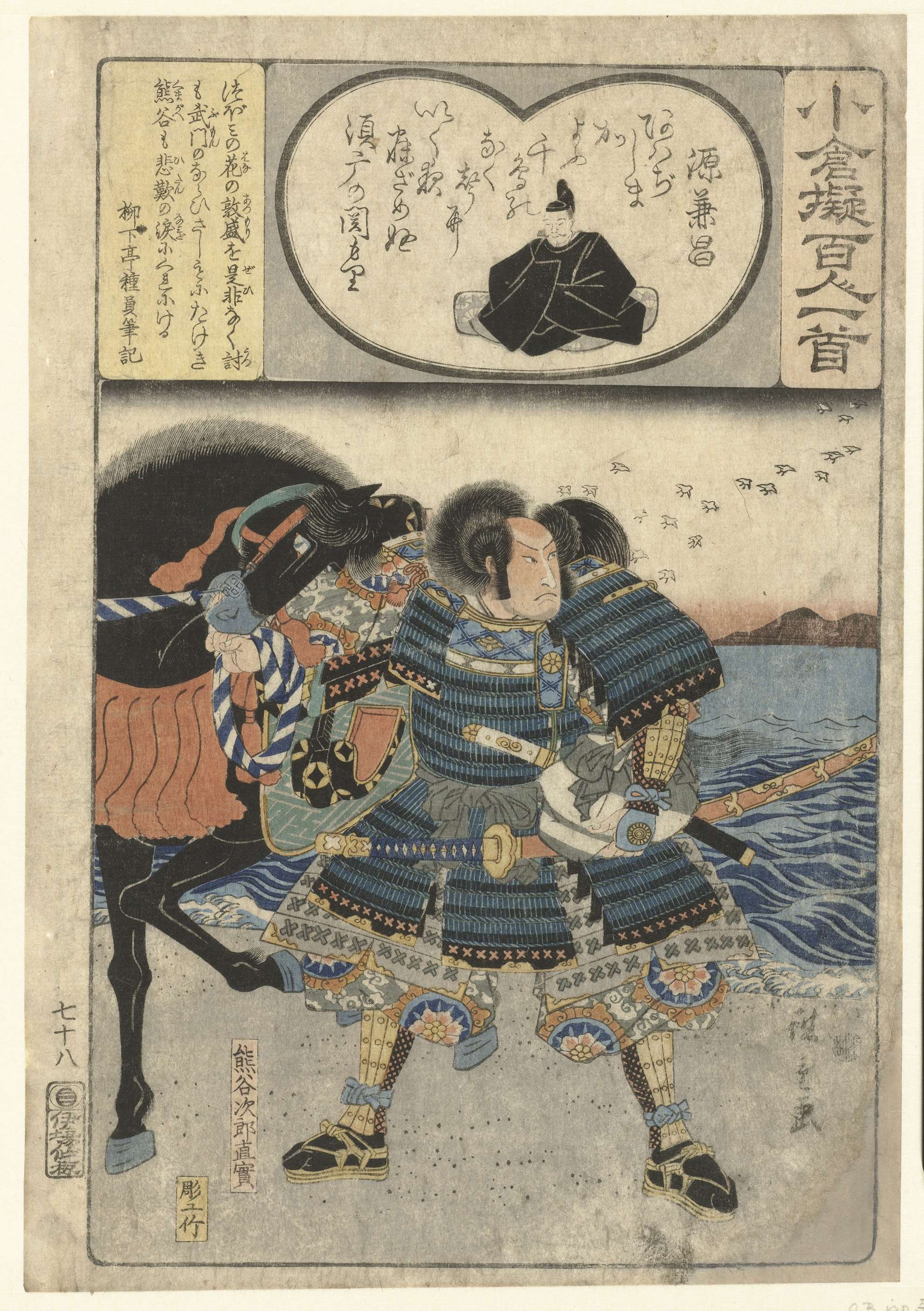 Man, Kumagae Jiro Naozane, in gevechtstenue, staand naast paard, bij zee. Gedicht in hartvormig cartouche met afbeelding van de dichter Minamoto no Kanemasa; in geel cartouche linksboven een commentaar op de voorstelling.