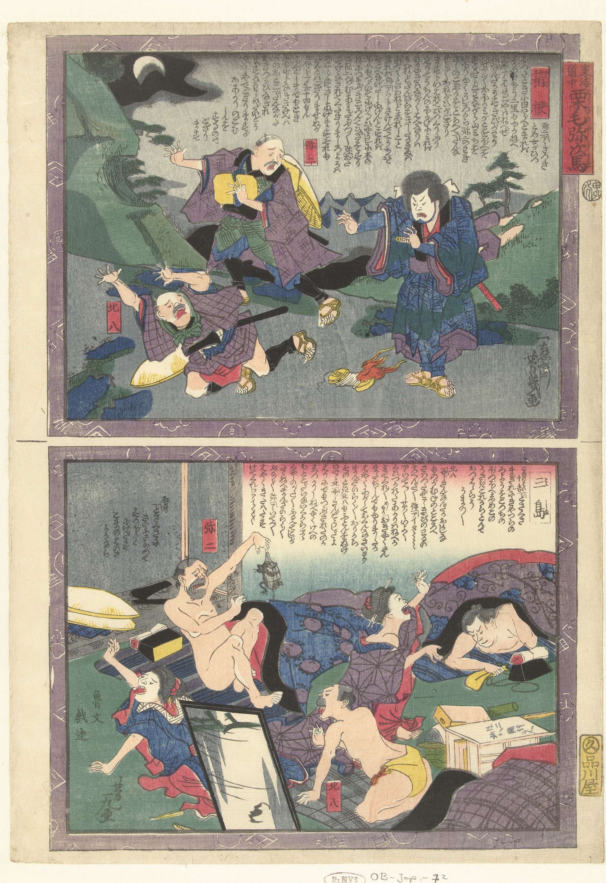 Twee afbeeldingen in chuban formaat, boven elkaar gedrukt op één blad. Boven: het station Hakone, de tiende rustplaats langs de Tokaido; drie mannen in een berglandschap bij nacht. Onder: het station Mishima, de elfde rustplaats langs de Tokaido; kamer met twee geisha`s, schrikkend van een schildpad zich vastbijtend in de vinger van een naakte man.