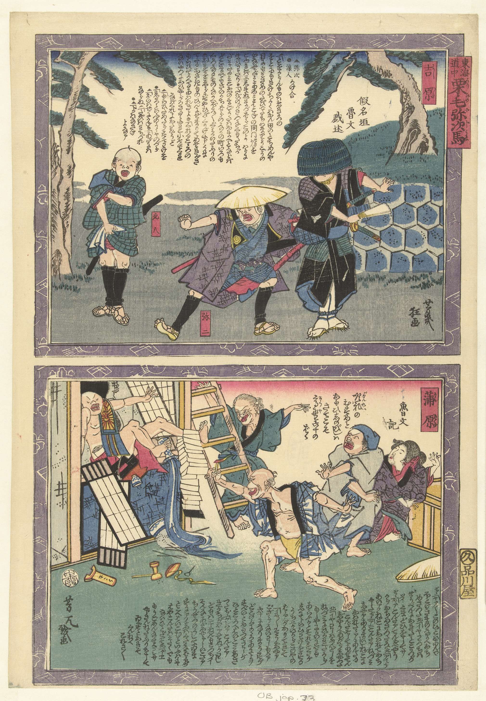 Twee afbeeldingen in chuban formaat, boven elkaar gedrukt op één blad. Boven: het station Yoshiwara, de veertiende rustplaats langs de Tokaido; drie mannen gekleed als reizigers, bij stenen muur en pijnbomen. Onder: het station Kanbara, de vijftiende rustplaats langs de Tokaido; oude man en vrouw bij ladder terwijl half naakte man door gevel valt.