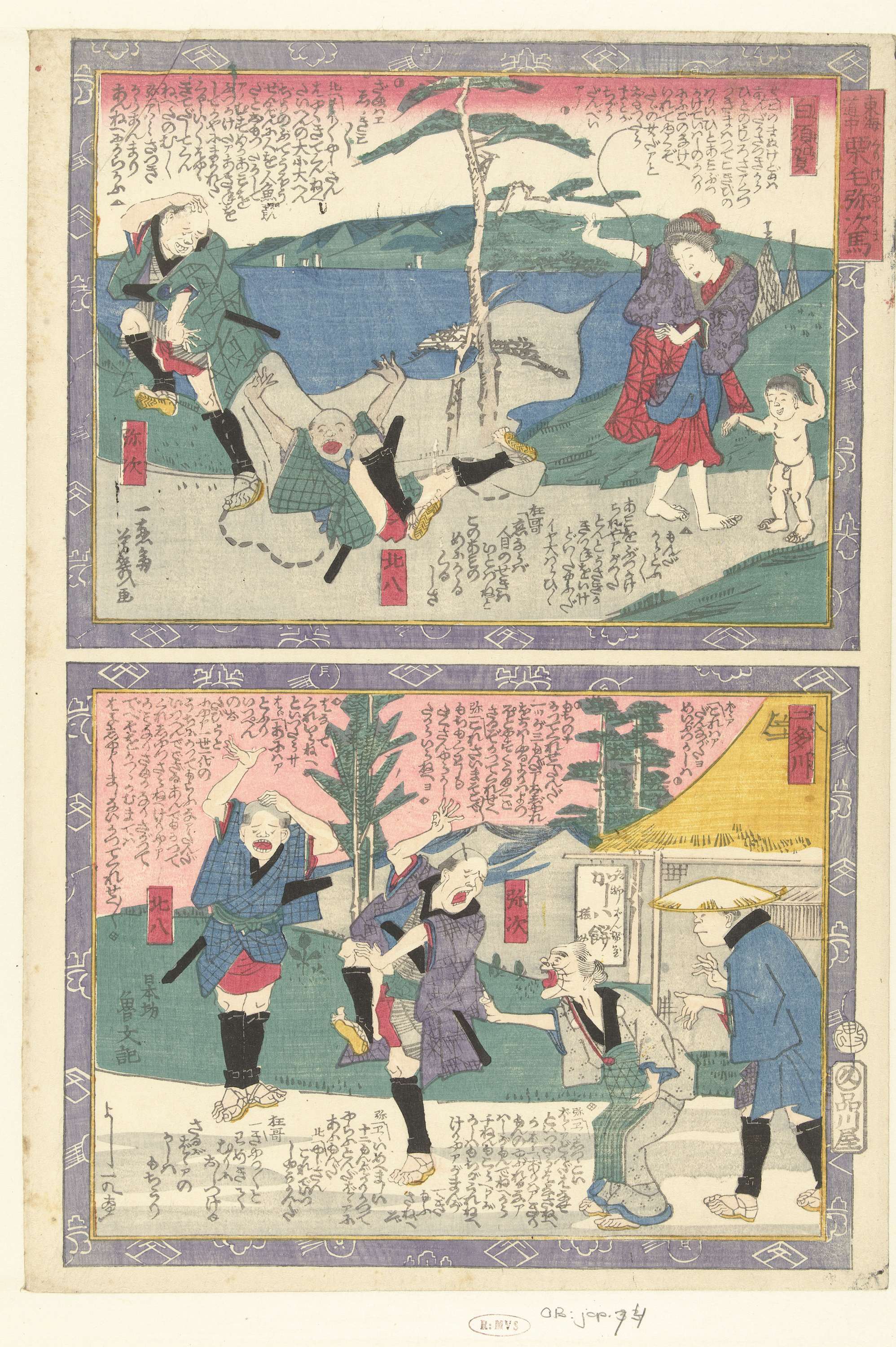 Twee afbeeldingen in chuban formaat, boven elkaar gedrukt op één blad. Boven: het station Shirasuke, de tweeëndertigste rustplaats langs de Tokaido; man en vrouw met kind kijkend naar over visnet struikelende man. Onder: het station Futagawa, de drieëndertigste rustplaats langs de Tokaido; twee mannen schrikkend van oude vrouw en man met hoed.