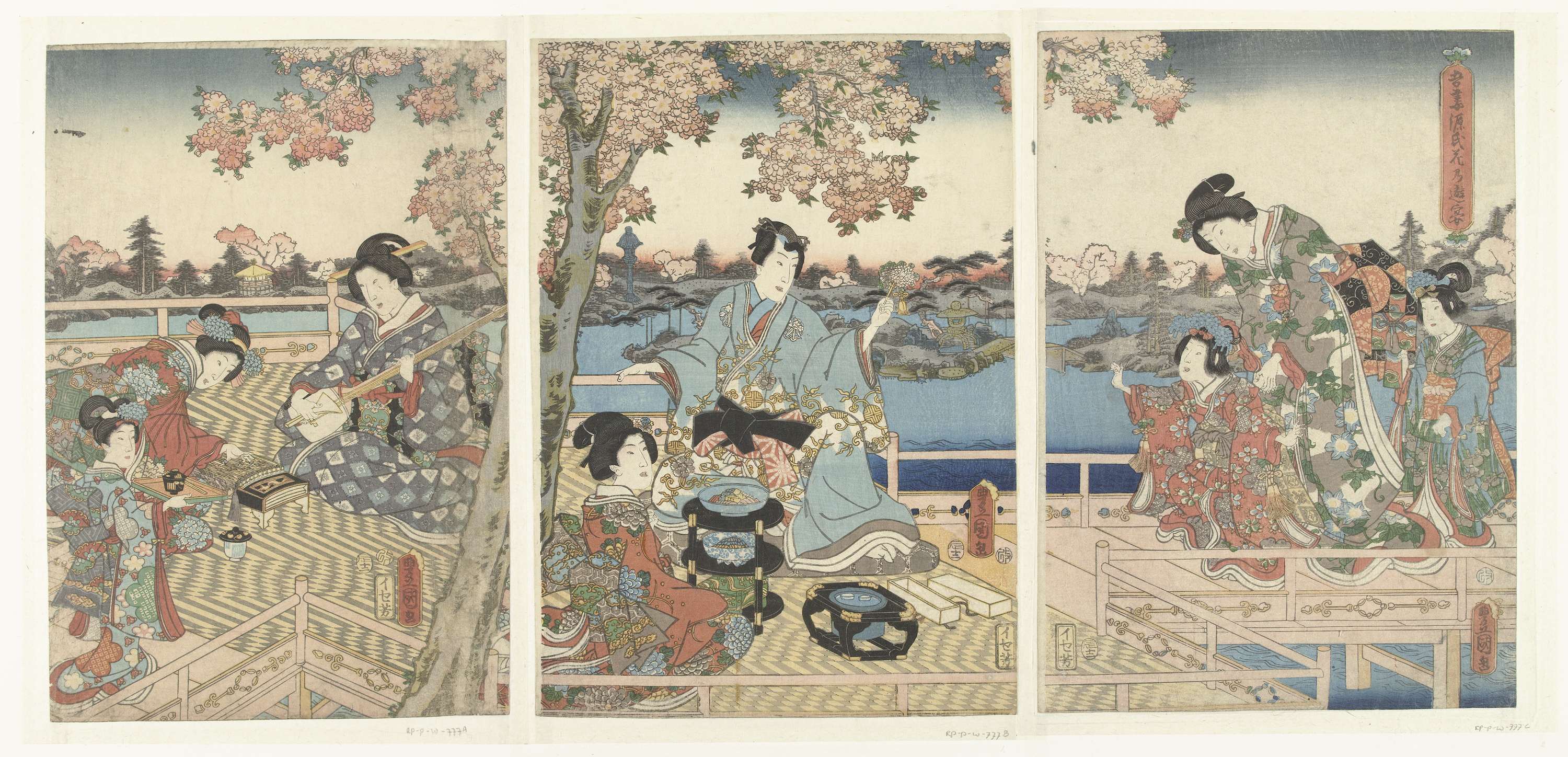 Prins Genji, in gezelschap van vrouwen en kinderen, zittend op een terras over een vijver; een grote bloeiende boom op de voorgrond.