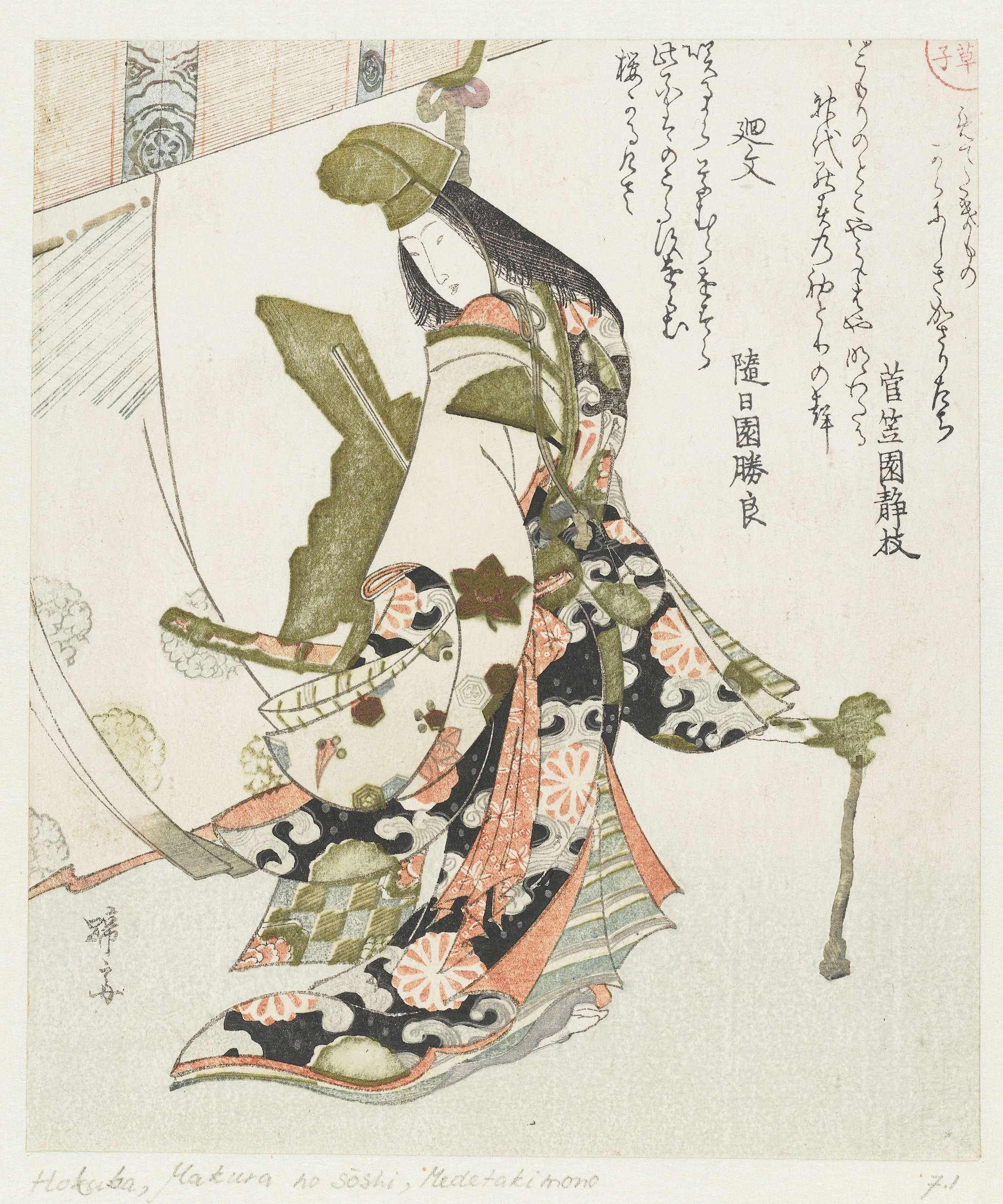 Een Shirabyôshi danseres met een hofhoed (eboshi), een lang zwaard en een staf met daaraan goudkleurige stroken papier (gohei). De shirabyôshi dans was zeer populair aan het hof en men droeg speciale kledij, zoals in de prent. Met twee gedichten.