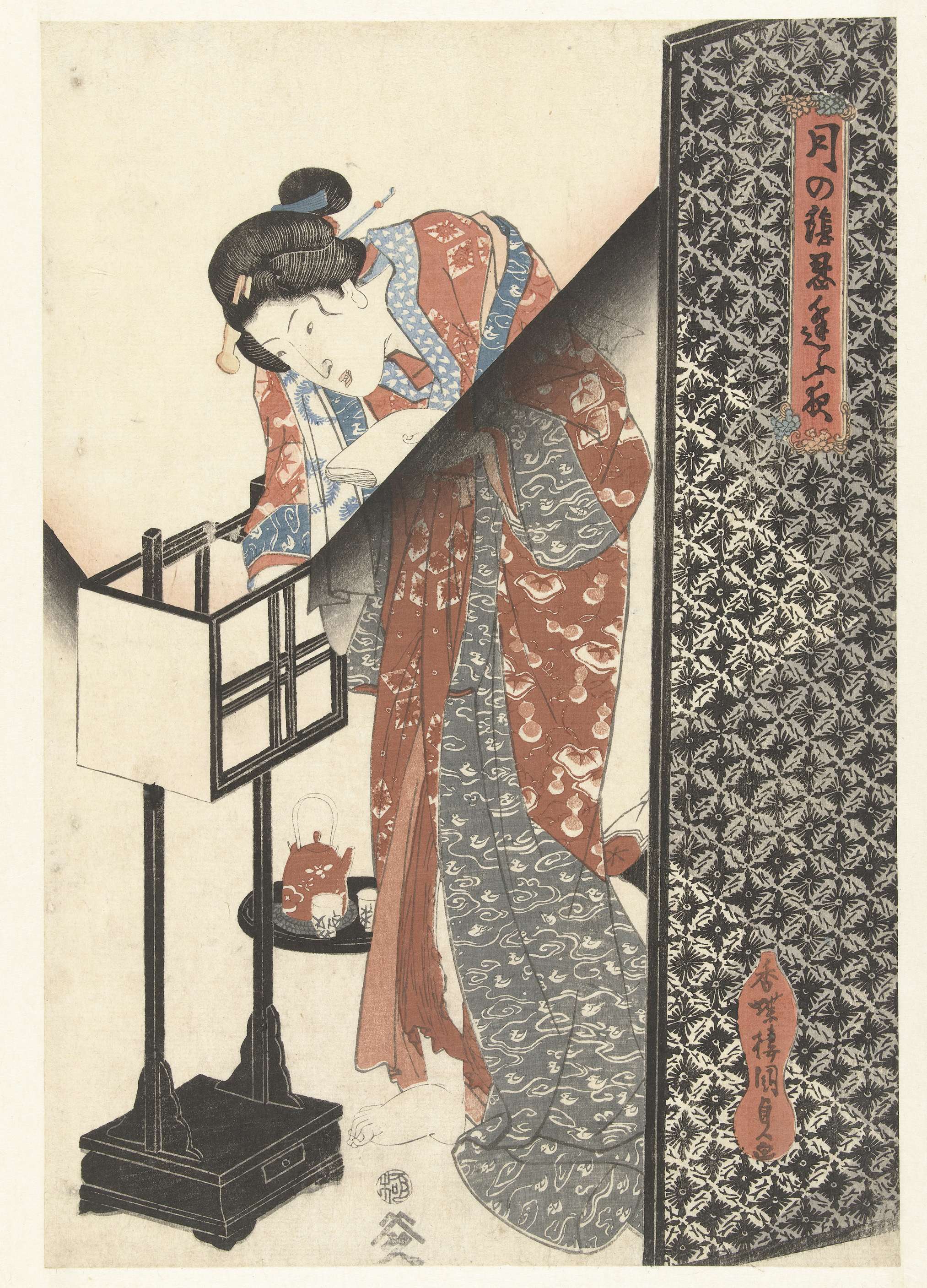 Vrouw op blote voeten, met bundel papier in linker hand, voorovergebogen bij lantaarn, naast kamerscherm; op de achtergrond een dienblad met theeservies en beddengoed.