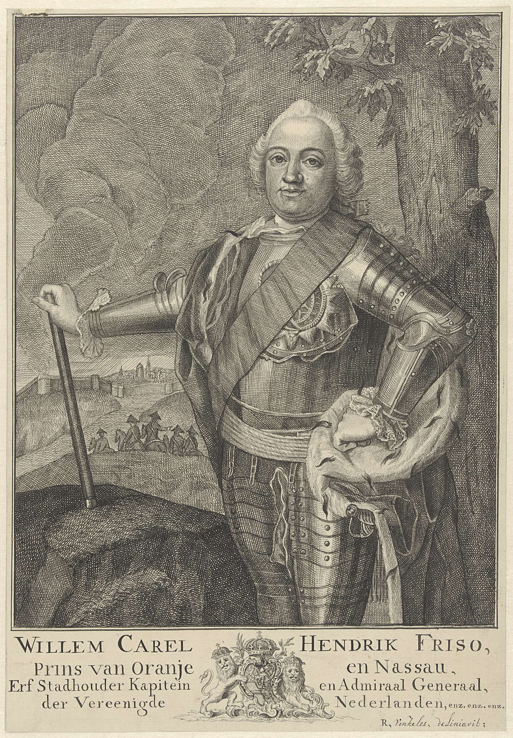 Portret van Willem IV. Opschrift: Willem Carel Hendrik Friso, / Prins van Oranje en Nassau, / Erf Stadhouder Kapitein en Admiraal Generaal, / der Vereenigde Nederlanden, enz.enz.enz. / R, Vinkeles deliniavit.