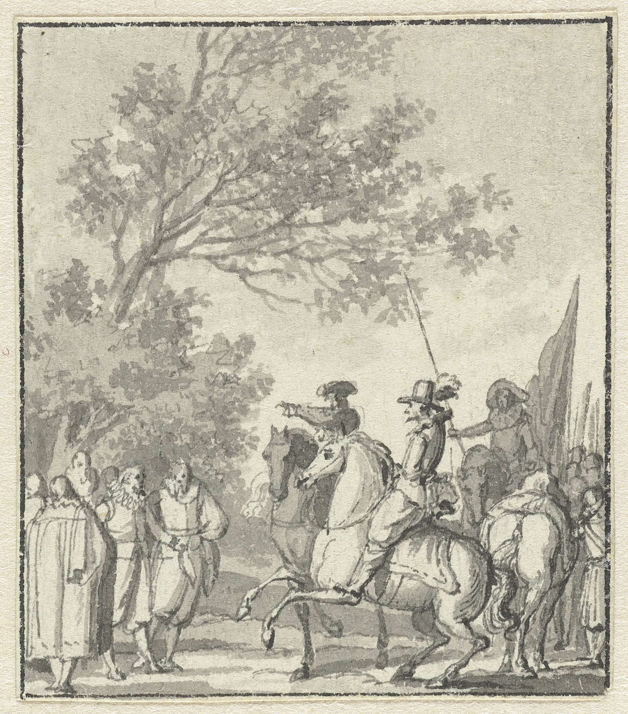 Burgers en enkele mannen te paard, waarschijnlijk Maurits of Leicester.