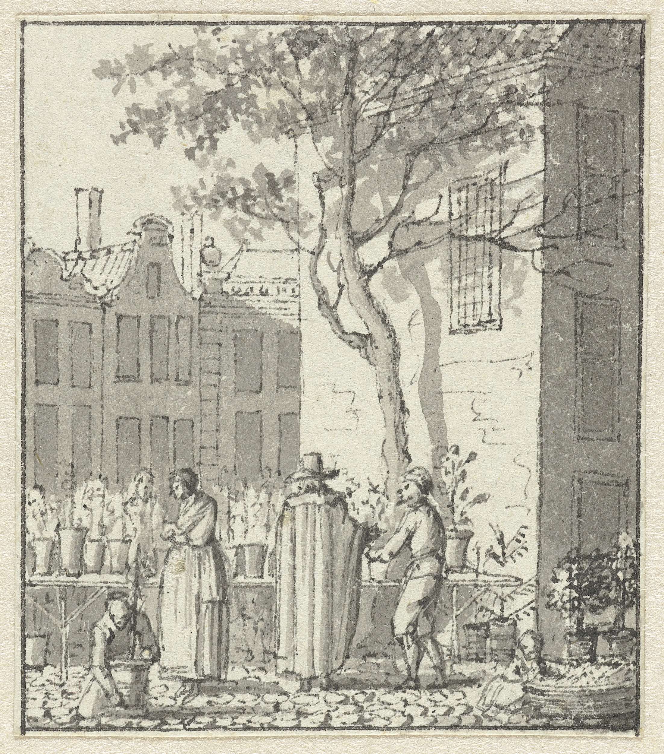 Verschillende personen in de weer met planten en potten, mogelijk in verband met de Tulpenmanie in 1637.
