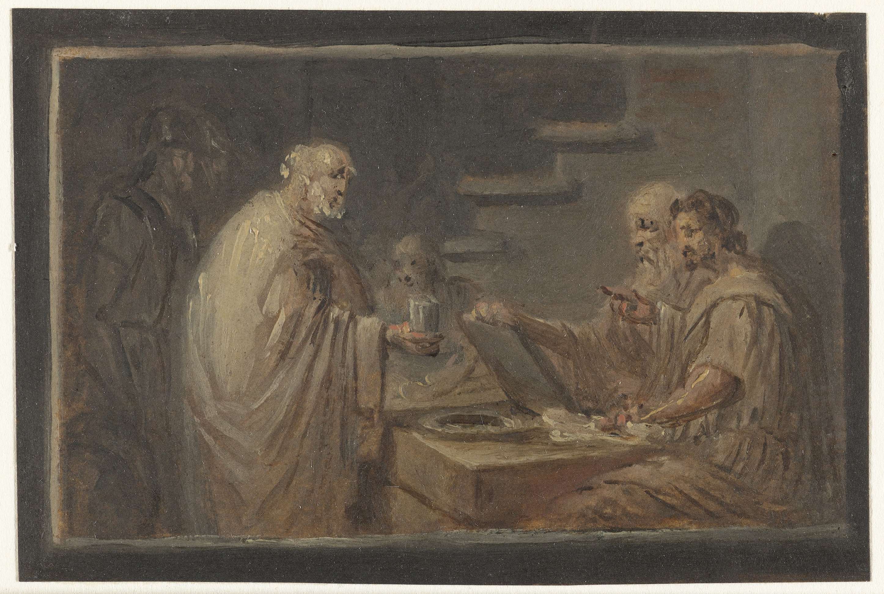 Man staande voor een tafel, waarachter twee mannen zitten