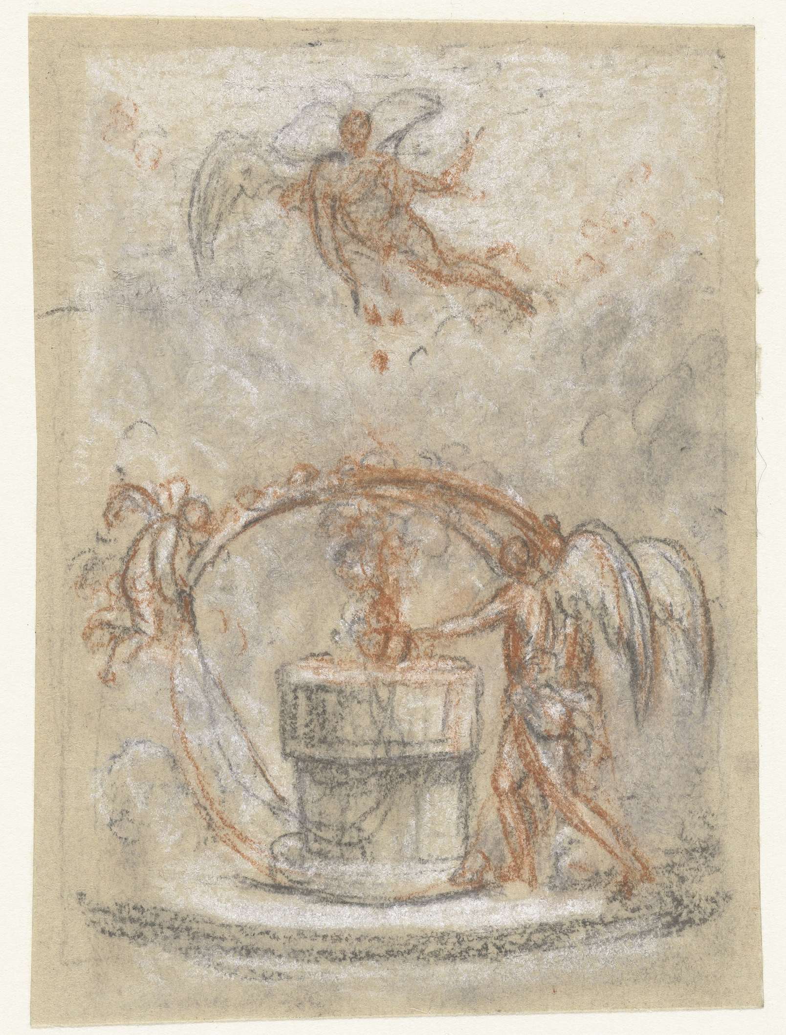 Allegorische voorstelling: figuren rond monument of altaar; een engel zittend in de wolken.