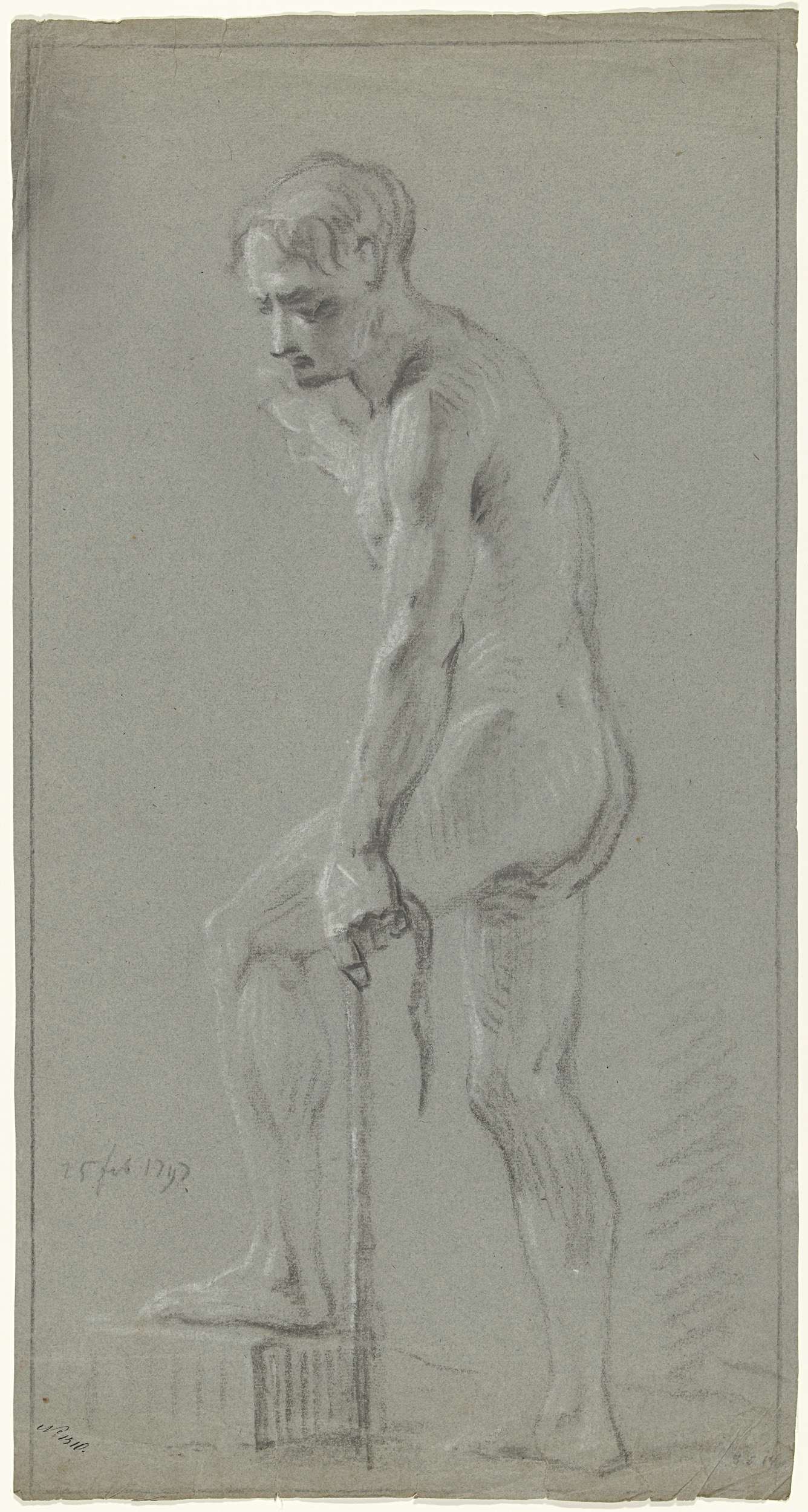 Staand mannelijk naakt, de linkervoet op een blok, trekkend met de linkerarm
