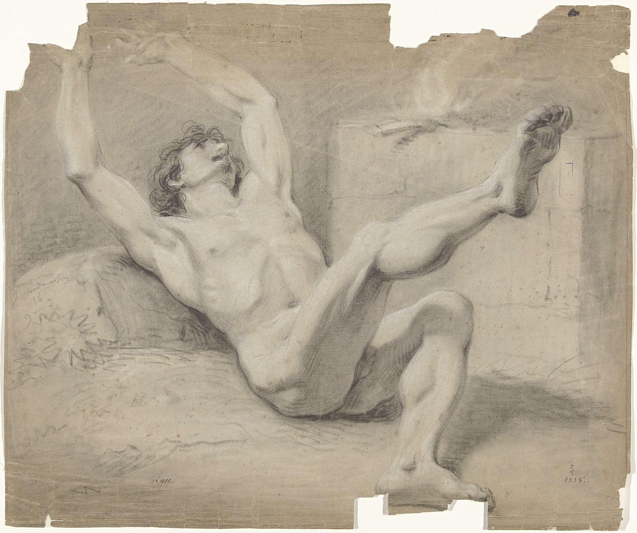 Liggend mannelijk naakt, de armen naar achteren en het rechterbeen opgetild