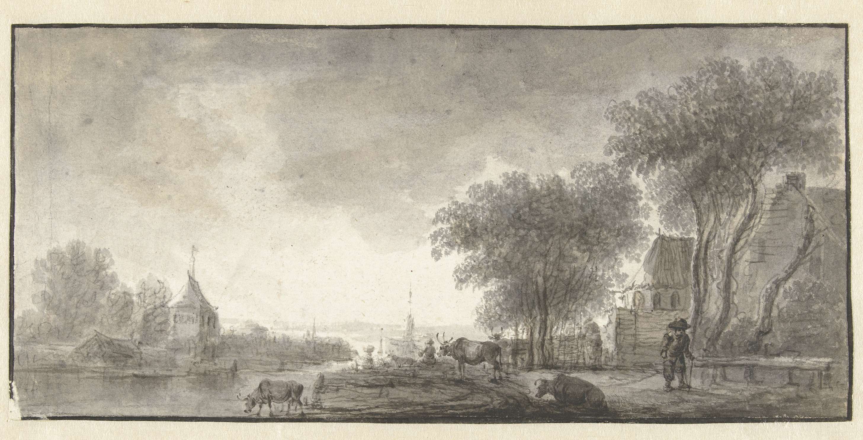 Rivierlandschap met vee en enige huizen; op de verso enige berekeningen in rood krijt.