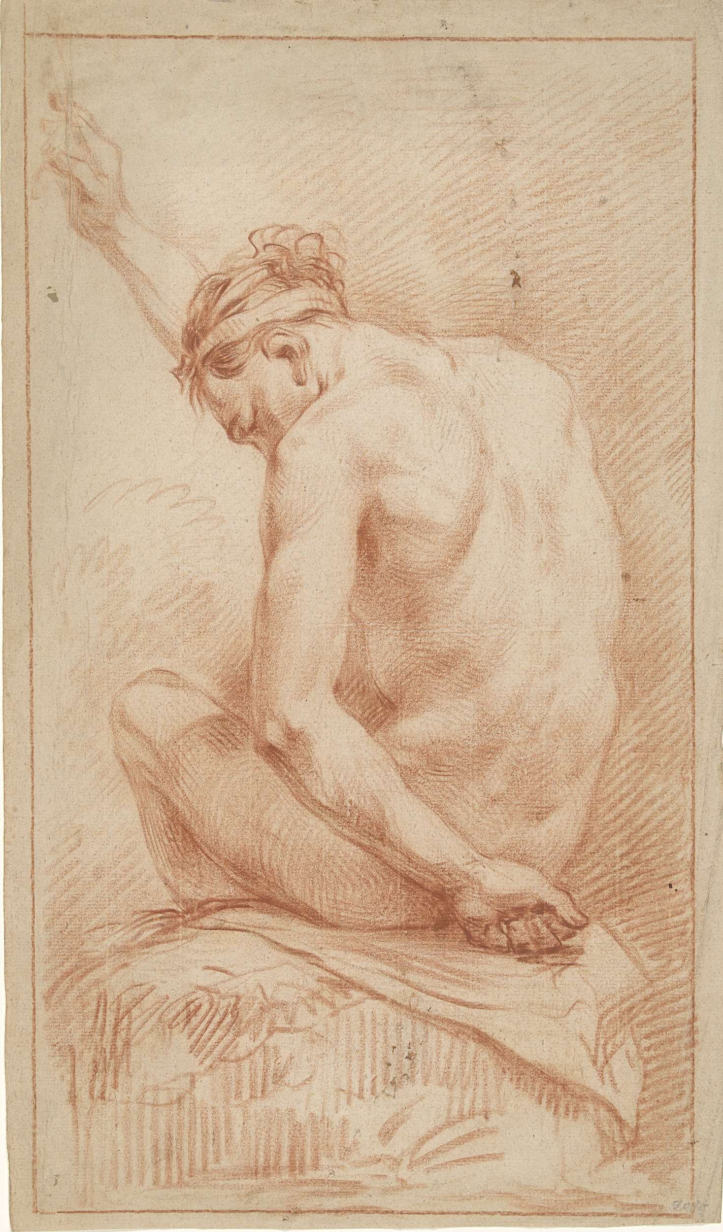 Zittend mannelijk naakt, iets naar links, op de rug gezien