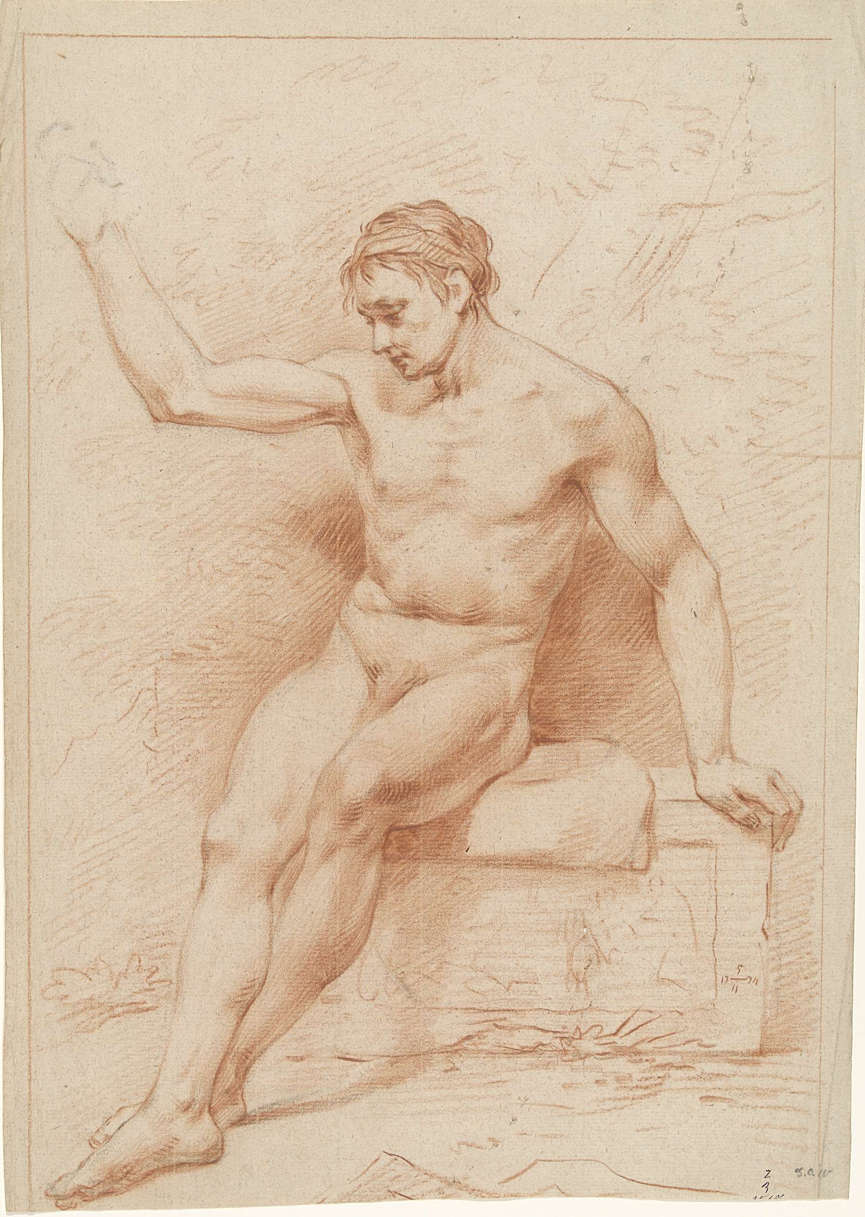 Zittend mannelijk naakt, het hoofd naar links, de rechterarm geheven