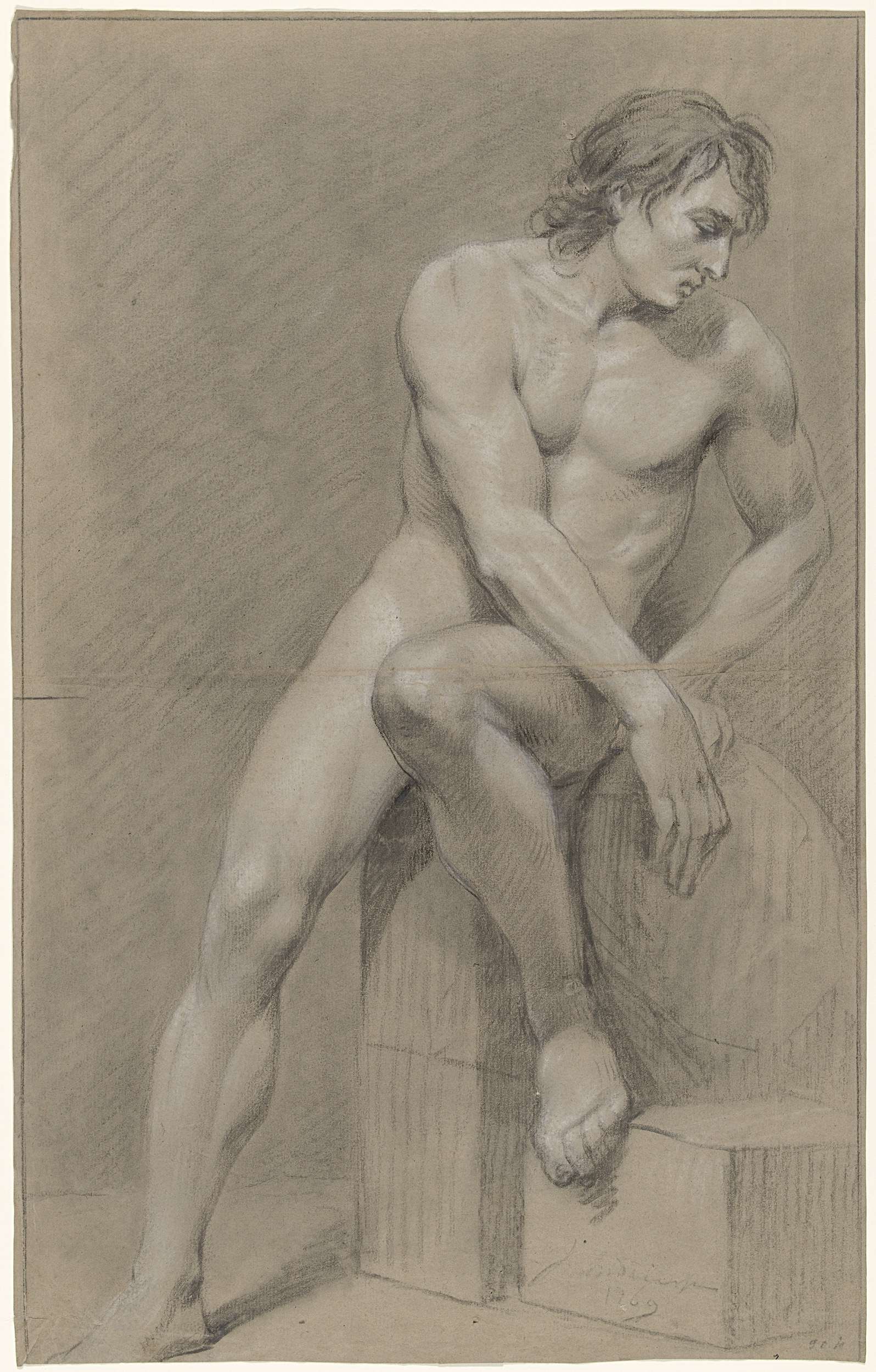 Zittend mannelijk naakt, naar rechts gedraaid, de linkervoet op een blok