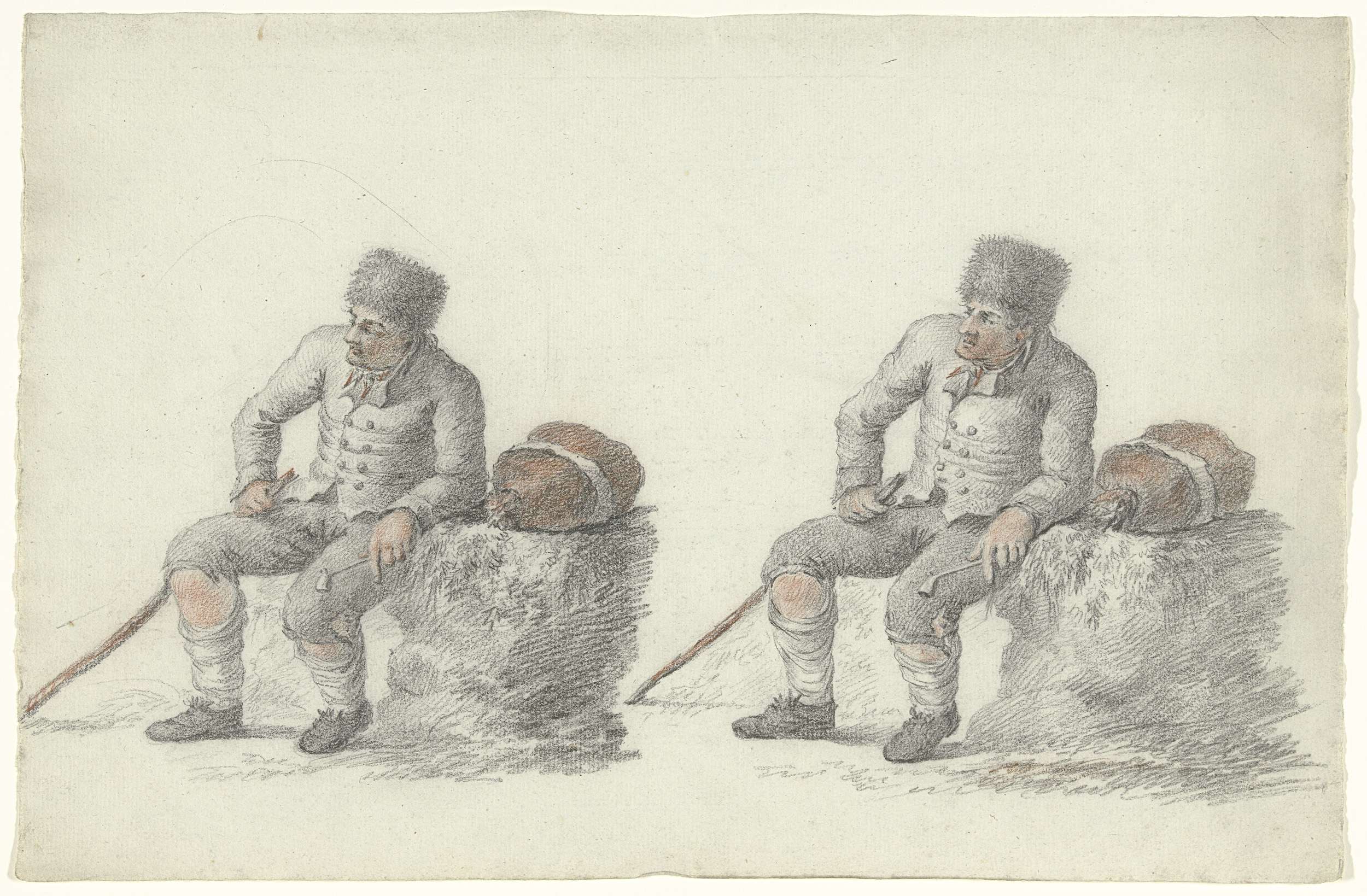 Twee studies van een zittende man langs de kant van de weg