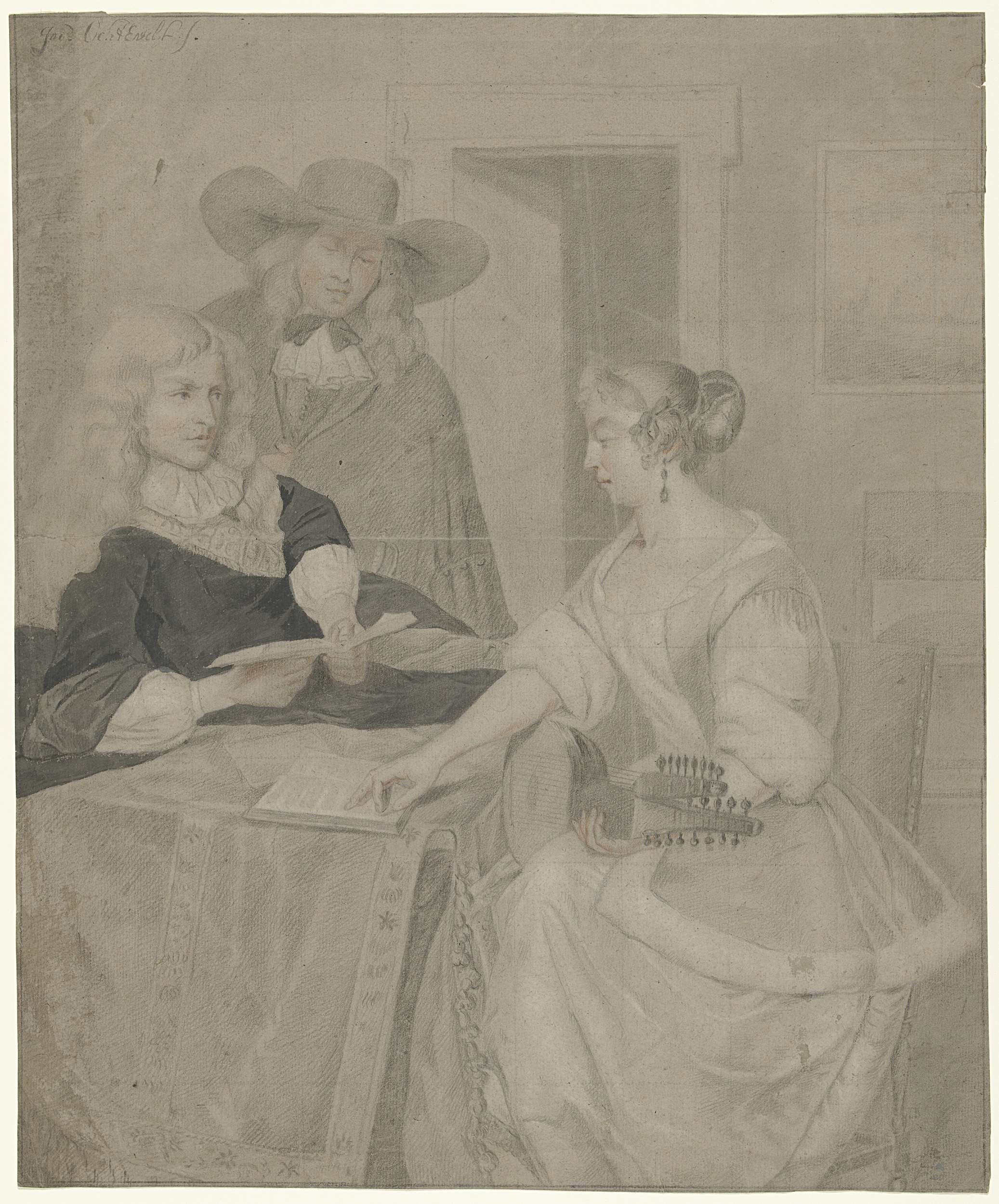 Musicerend paar aan tafel; een staande man kijkt toe.