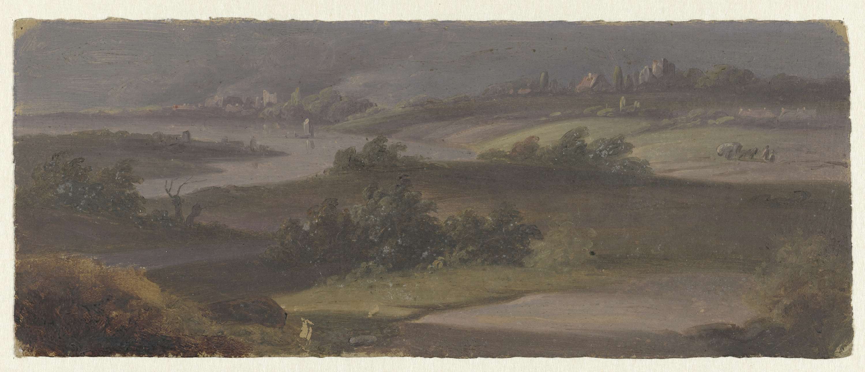 Landschap met rivierbocht en donkere lucht
