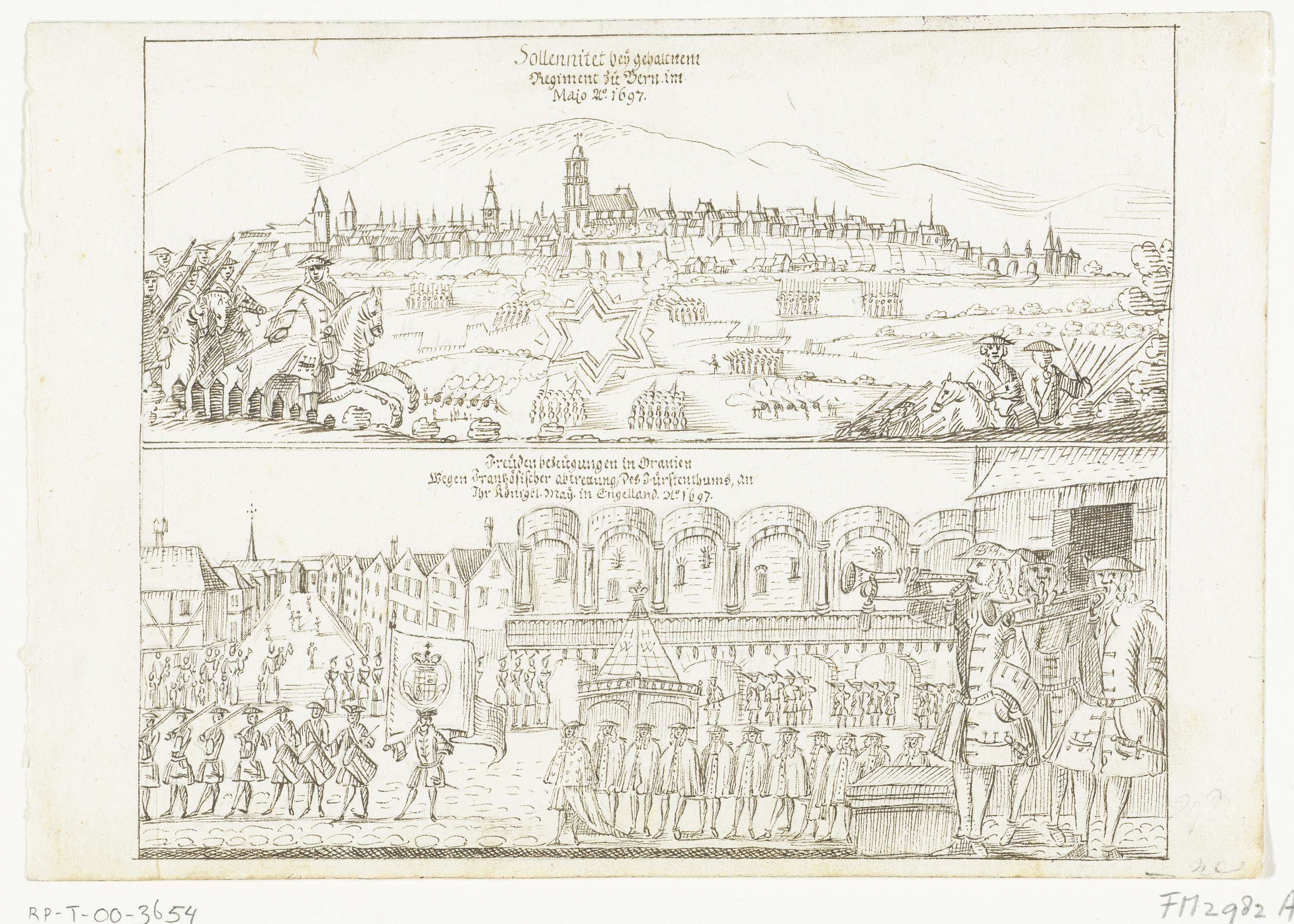 Ceremonie in de stad Orange bij de teruggave door Frankrijk van de prinsdom Orange aan koning Willem III, onderdeel van de Vrede van Rijswijk van 1697. Onderste helft van een Duitse tekening, bovenaan een gezicht op Bern in 1697